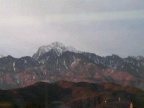 山々に朝陽が当たって、うっすらと雪をかぶった山々が、赤く紅葉しているかのようです。