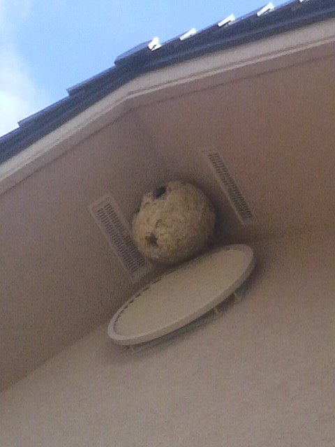 居心地のいい新居にリフォーム中のご様子で、いらなくなった巣の中のスズメバチ作成の旧部品を時々テラスに落としています。
