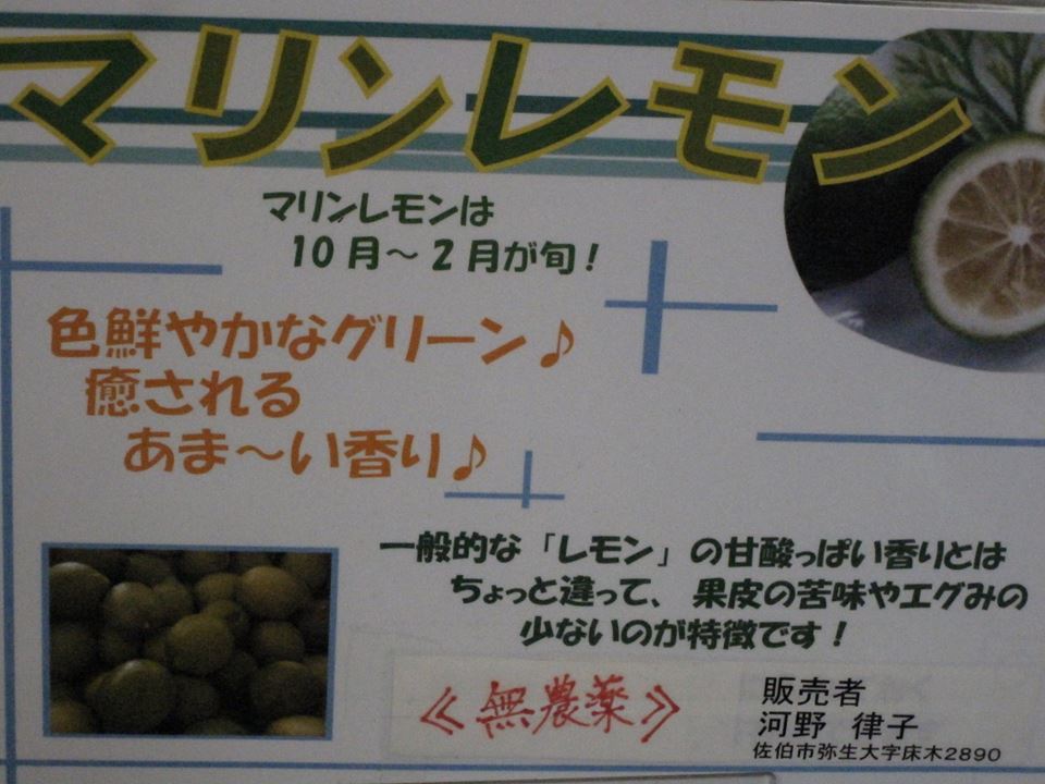 道の駅「やよい」ではマリンレモンを格安で販売しています。 マリンレモンは本来はこの地区の海辺に近いところで数軒の方が栽培しているはずです。 何故、山間地の弥生で売っているのか?取り寄せただけだろうと思い生産者欄を見て驚き! この近所で作っています。興味があり生産者を探しました。 いたいた。若いお姉さんでビックリ。農家?聞くと両親と共に経営しているようです。 他にも玄米や烏骨鶏の卵などをここの売り場に出しているそうです。 マリンレモンは海辺の生産者から分けて貰った枝を接木で育てたとの事。 以前、鶴見の生産者を訪ねたところ完全無農薬は難しいので減農薬だと聞いていました。 しかしここのは何もやっていない無農薬!そんな良いものが1個たったの60円とは。 2倍での良いだろうと思いながら買って食卓に添えました。 予想通りの香りですが輸入品のレモンと違いあまり酸味がない。 皮部分もしゃぶりました。そのままケーキにも使えますね。
