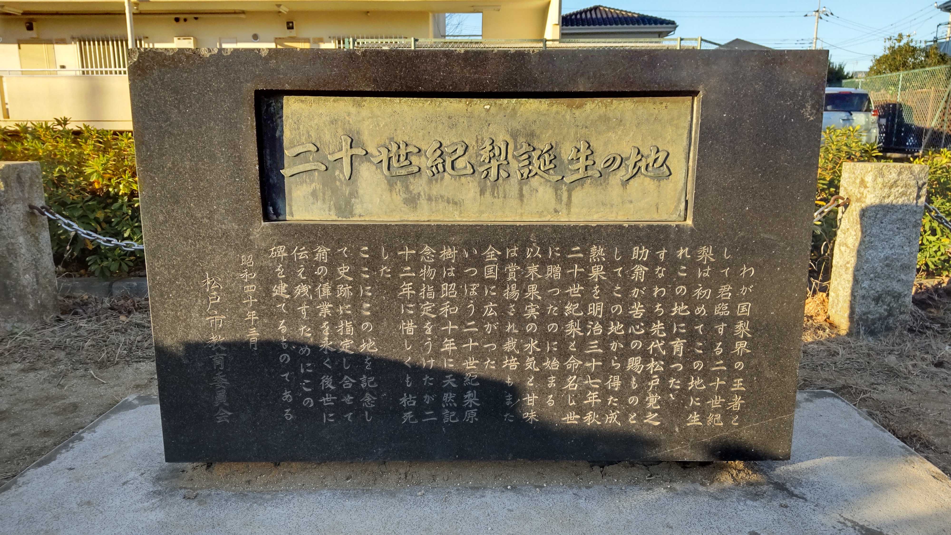 1月11日(水)今日は鏡開きの日です。それには全く関係ないのですが、二十世紀梨発祥の地に行きました。松戸市が梨の二十世紀の発祥の地なんです。今は生産は鳥取県が多い様です。この場所は地名も二十世紀ヶ丘です。かつてはここに原木があり、国の天然記念物に指定されたそうですが終戦間際の空襲で焼夷弾により傷つき、2年後の昭和22年に枯れてしまったそうです。勿体ないですね。今は小さな公園の片隅に碑があるのみ。こちらは帰り道に通った風早神社。去年の秋まではマロと言う名の茶色の老猫が狛犬のように鳥居の脇に佇んでいました。おや、いつの間にか交代したのかな?切株の上に別なネコが鎮座していました。