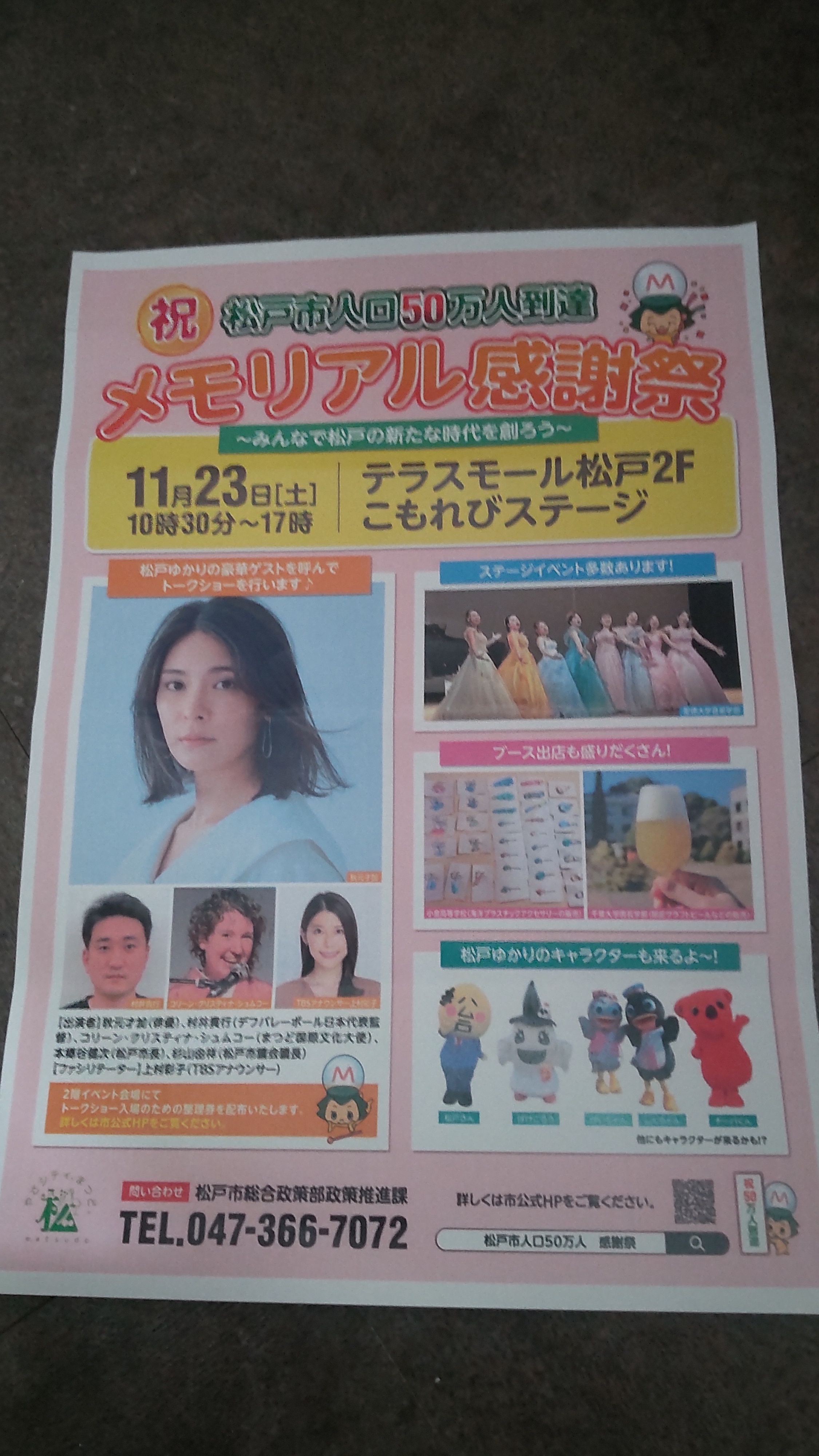 11月24日(日)これは昨日の事でした。松戸市の人口が50万人を超えたのでそのイベントです。ミーハーな私は有名人が来るとのことでのこのこと行ってみました。トークイベントは松戸市出身者や縁がある人が来ました。秋元才加さんも松戸市出身です。100名には事前整理券を配られ、着席で見れます。無事ゲットし、妻と聞きに行きました。さぞかし外国人が増えているんだろうと思っていましたが、最新のデータでは2万2千人との事。5%にも満たないんですね。でも、出身国は100か国にも及ぶそうです。まさに多様性です。と言うか多国籍で驚きです。新松戸駅周辺は肌の色が様々な人がいて、異国の感じです。お散歩ジョグで見かけたダイヤモンドリリーです。彼岸花に似ていますが色や形が優雅ですね。モミジもいい色合いです。
