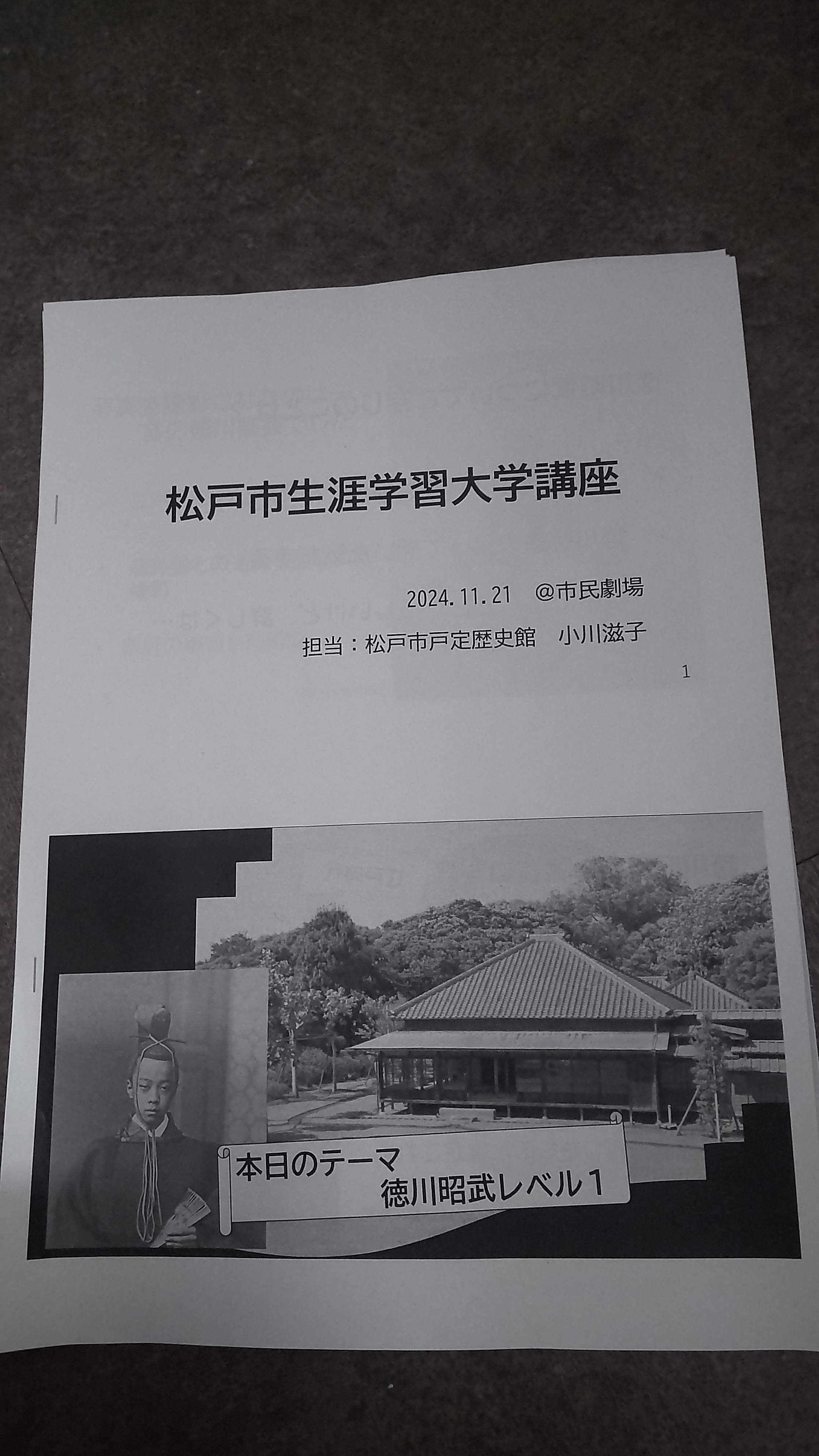 11月21日(木)今朝のジョグは15kmと少なめでした。と言うのは、今日は松戸市生涯学習大学講座の日だったのです。会場の松戸市市民劇場まで片道のジョグでした。着替えの服を背負ってえっちらおっちらです。そのまま素直に向かうと6kmくらいで早すぎるので遠回りしました。この講座は松戸市が主催で高齢者向けの約半年で全8回のものです。対象者は在住の60歳以上の人です。200人ほどの参加者ですがおそらく70歳以上が多い感じです。たぶん私が最年少かも知れません。今回は4回目で、テーマは徳川昭武。この方は徳川幕府最後の将軍、徳川慶喜の弟で水戸藩主であった方です。隠居後の住まいとして松戸に戸定邸を建てました。松戸市に関連する人物という事で取り上げたのでしょう。ところで、先日の兵庫県知事選について。テレビ報道はどこもSNSのデマに騙された兵庫県民が斎藤さんへ入れたと言ってます。これはちょっと酷いよねえ。まるで、兵庫県民をバカにしている様に聞こえます。デマかどうかを調べて報道しないのが理解不能です。通りがかりの銀杏並木です。もう散り始めました。一気に冬ですね。