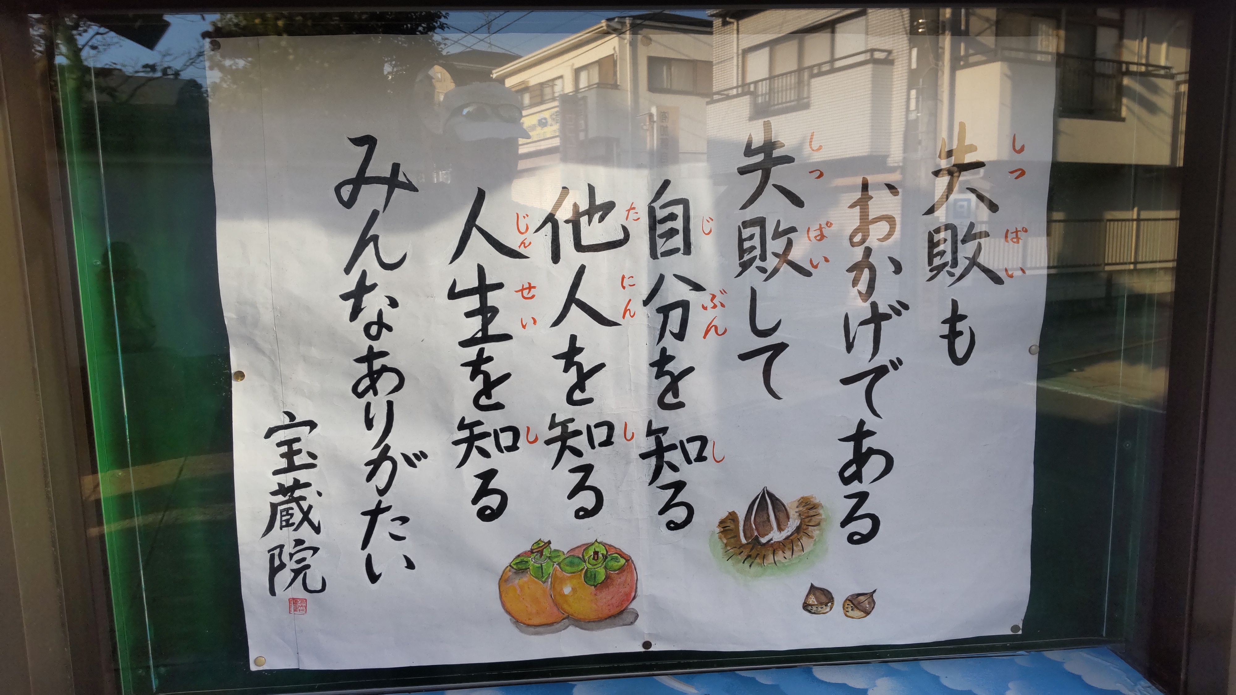 11月15日(金)これは昨日の話です。毎朝のお散歩ジョグで30kmをノンストップで走れました。所要時間は2時間54分。スピードは競いません。マイペースのジョグです。葛飾区の金町までの往復です。まあまあですかね。次は40kmかな?下の写真は途中のお寺で見かけた物です。失敗は成功の元とか母とか言われるものと同じ意味でしょうね。この猫はちょっと怖い。何でそんなに怒ってるの?公園の木々も綺麗になってきました。ところは比較的暖かかったですが来週からは寒気が入ってきてグッと冷えるようです。インフルも多くなったそうで気を付けましょうね。