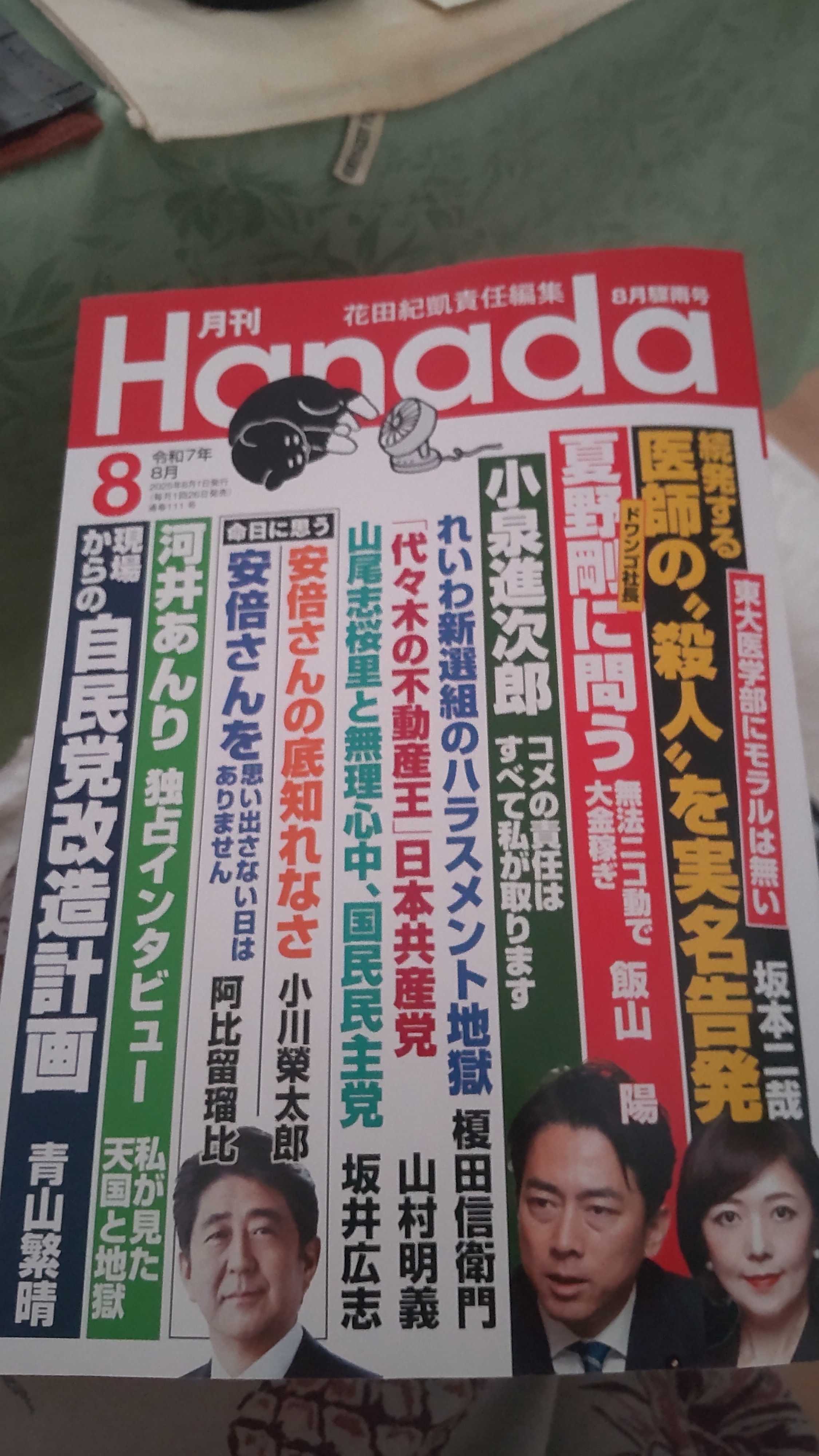6月26日(木)今朝もどんよりの空でした。途中で結構降られて雨宿りもしましたが、ジョグは26.2km。汗と雨で全身ぐっしょりでした。写真は、今日発売の月刊「Hanada」です。だいぶ右寄りの雑誌です。少し前までは「日本保守党」を応援の記事が多かったですが、今は批判です。百田代表と編集長が決裂したようなんです。飯山陽さん擁護になりました。そんなのはどうでも良いのですが・・・巻末に近いページの「読者から」のコーナーに私の投稿が載りました。駄文ですが良ければ立読みで見て下さい。内容は前号で慶應大学の90歳の名誉教授が書いた自転車の歩道走行についての同調。あっ、これには本名が載ってる。身バレしちゃいますね。レモンが3cmくらいになってきました。でも、花もまだ咲いてます。どうなってるの?市内では枝豆の直売も目立ちます。