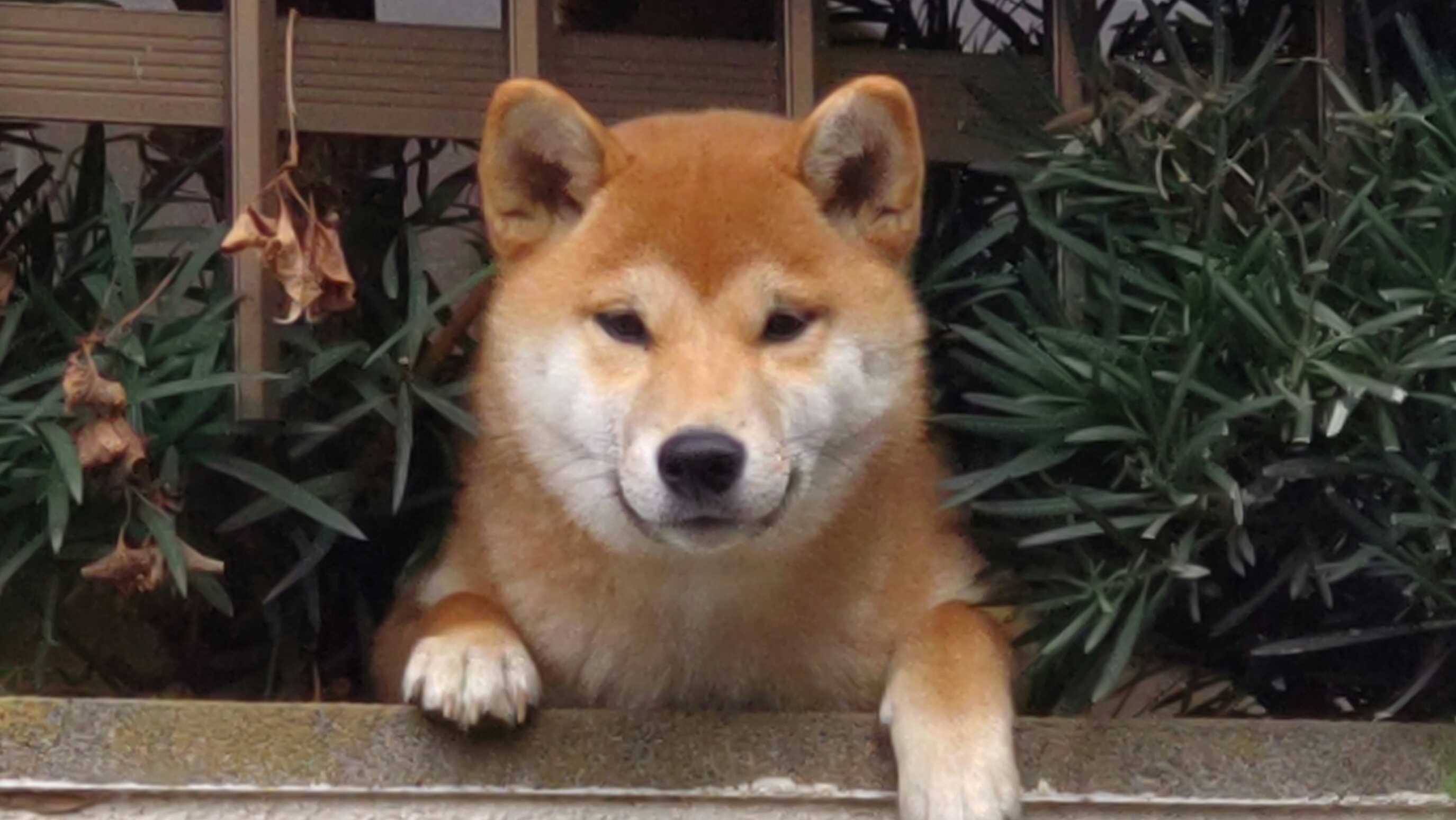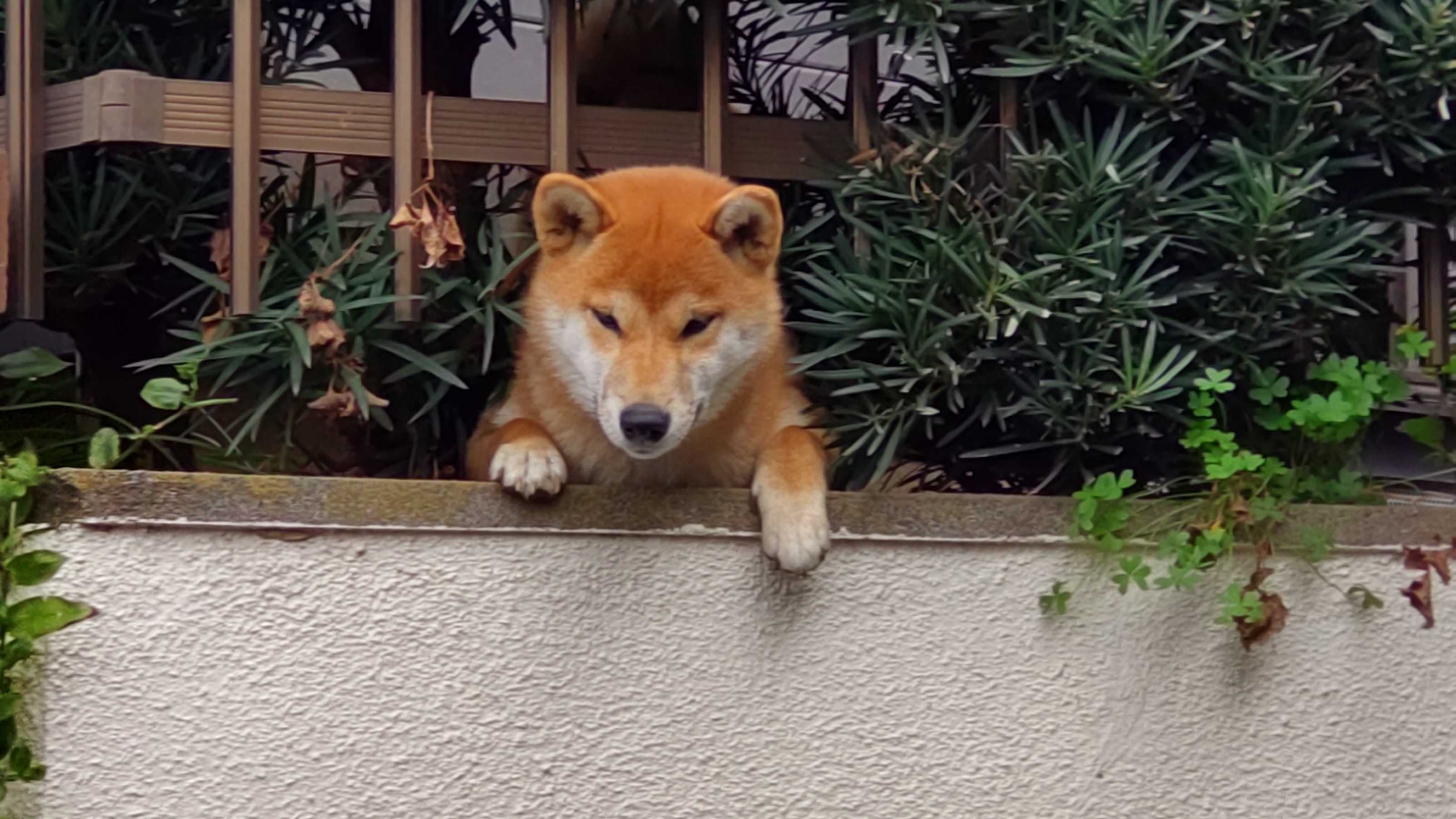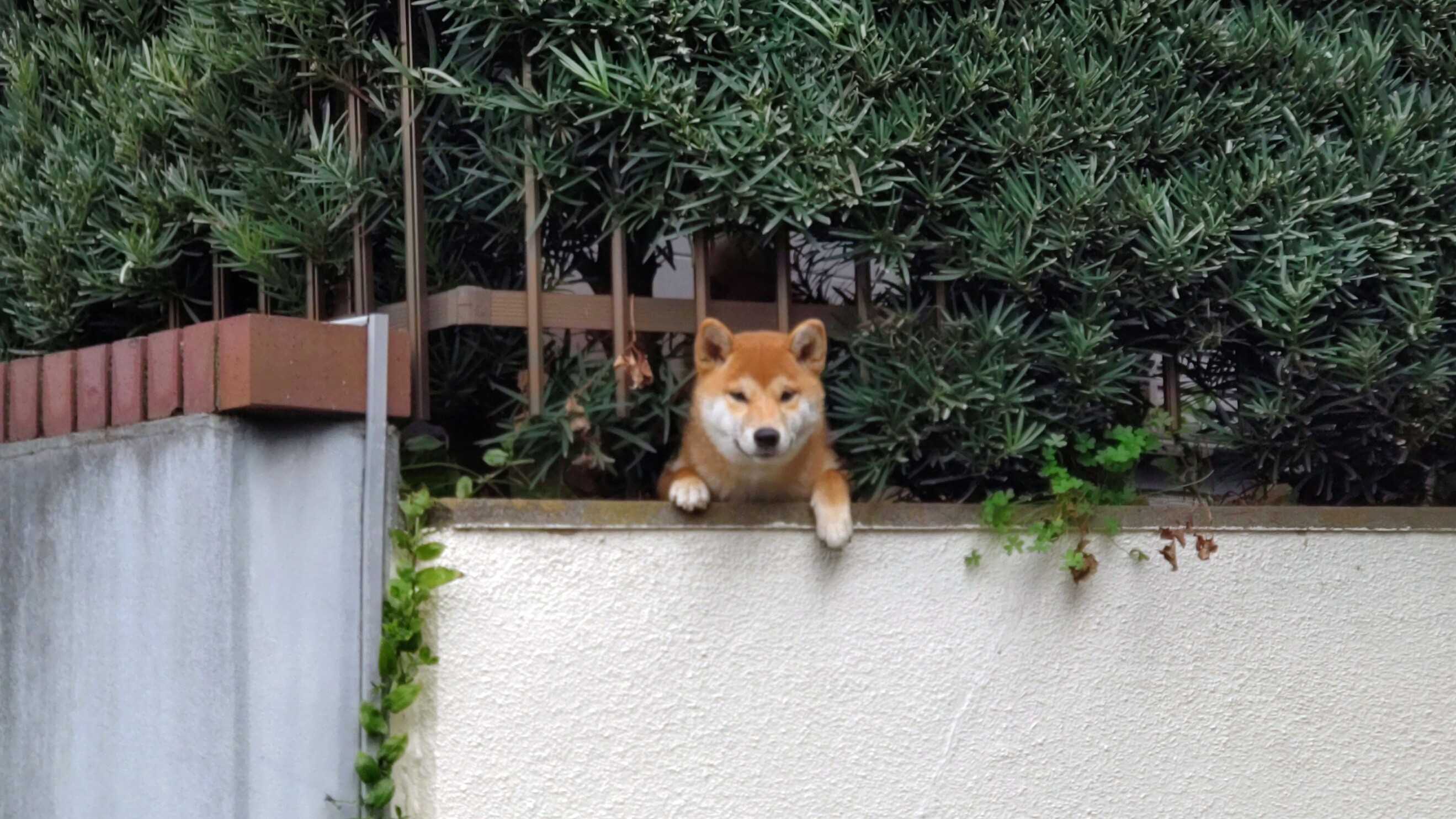 近所の家のシバわんこが垣根の下からコンニチハ。