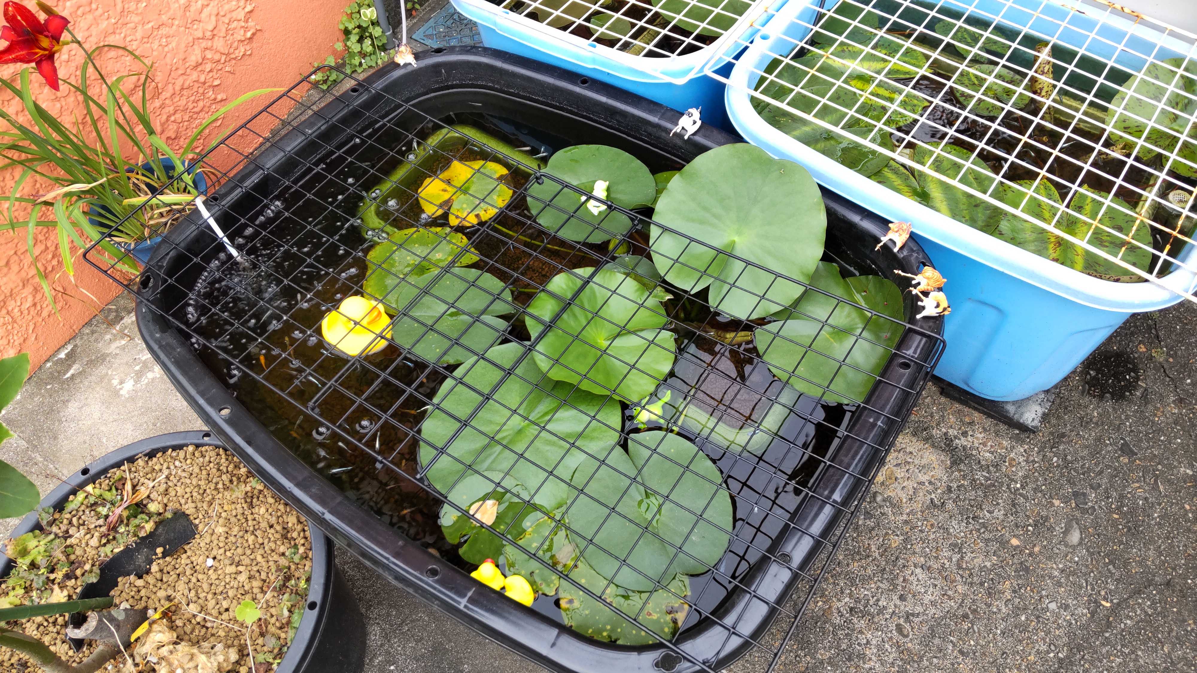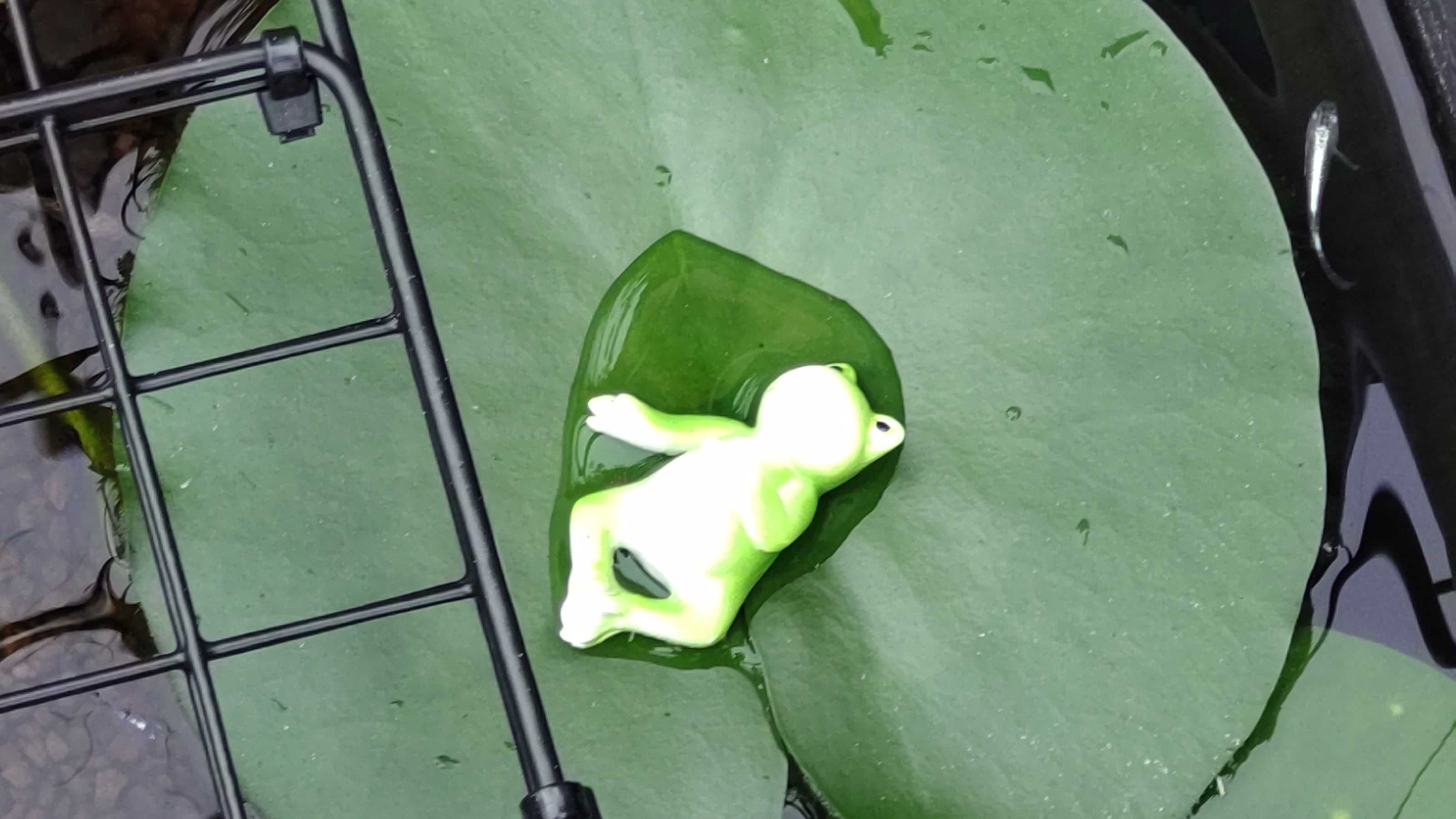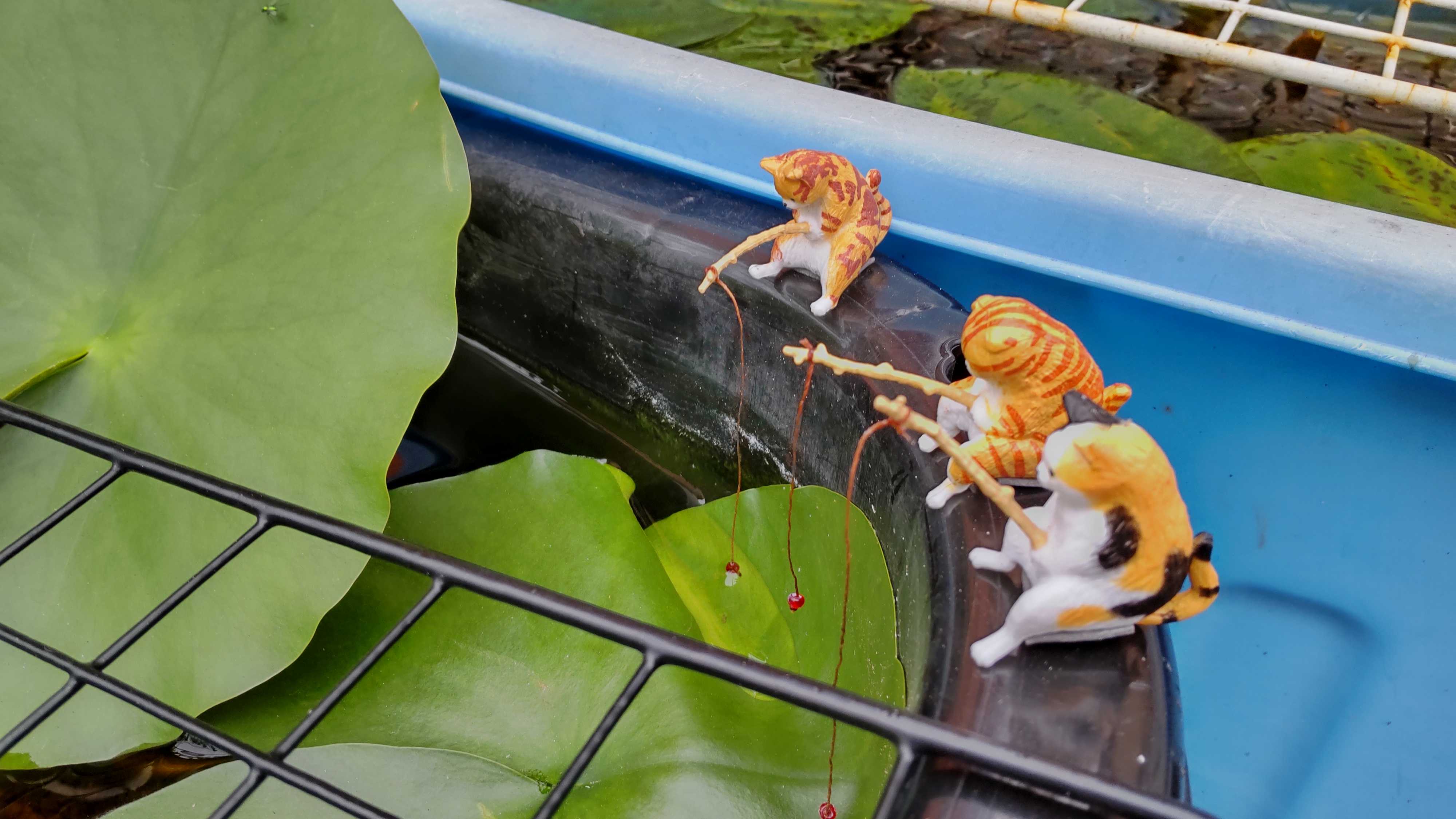 カエルやアヒルちゃんを浮かべていて、また周囲にはネコの釣り人達が。