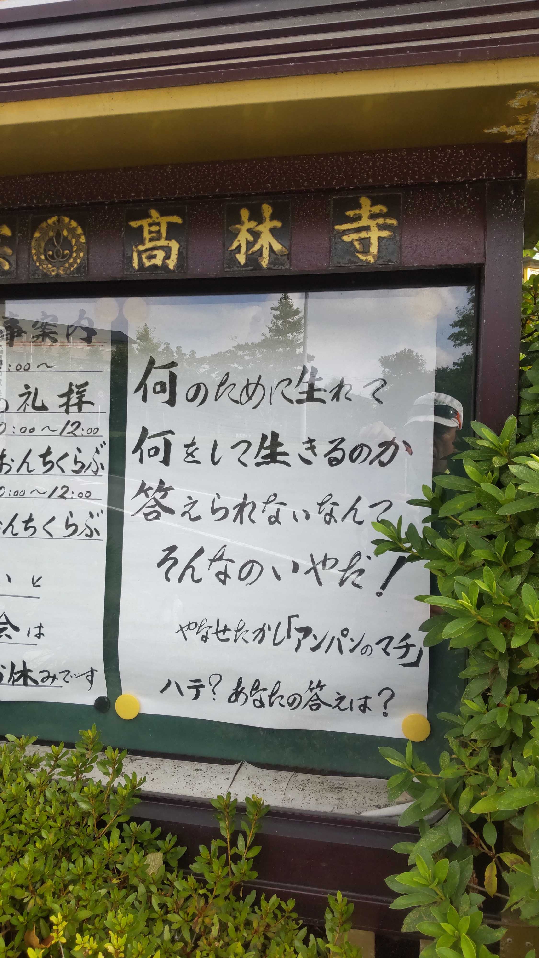 お寺の掲示板には、アンパンマンのマーチの一節が書かれていました。