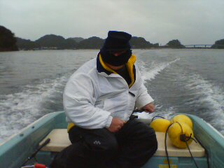本当に昨日は寒い日でした。しかも雨ですので最悪です。今まで、雨でも心が折れることはなかったですが・・・・昨日はどうしてもチャレンジしてみたいことがあって出撃したのですが・・・・・・・結果は500ぐらいのが一杯、蛸が一つという感じでした。連れは、同じサイズが2杯と200ぐらいが一杯という激渋でした。あまりの寒さに手が・・・・こんな日に限って手袋を忘れました!手が痛くなってきたので操船を髭エギさんに交代!そういえば昨日は髭エギ(正式名称がわかりません?)が好調でした。(イカのチェイスもありました。)・・・しかし僕はもっていないしチェイスもなかったです。この写真、別に顔を消しているわけではありません。目の部分だけ開いている防寒具です。)あまりの面白さで写真を撮ってしまいました。チャレンジもところどころでしてみましたが、船がうまく流れなくて、失敗です。また日を改めて、チャレンジしてみます。昼に上がりましたが、しばらくは指の感覚がなかったです。