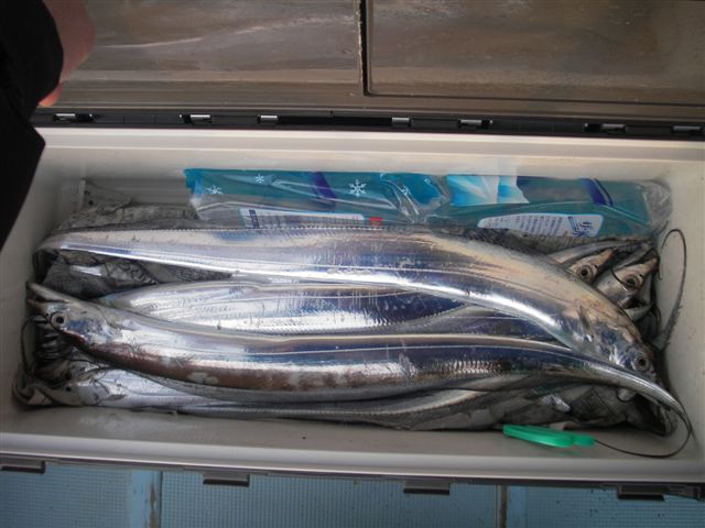 昨日はSakoNahoEikunさんとE○P軍団と○林○具の方と松山に太刀魚ジギングに行ってきました。遊魚船の釣り座が到着順ということで、なんと2時集合!(おかげ様で、自分のお気に入りの場所へ入れました)今の松山沖は潮の動きが大きいときはあまり釣れないらしく、前日・前々日も釣果はよくなく前日は20本で竿頭という悲しい情報・・・・・昨日は一応中潮なので、少しは期待をしたのですが・・・し・し・・・・渋い・・・渋すぎです結果・・・・・ 22匹となりました。(型は良かったです。)この日のために新兵器を投入 なかなか良かったです。高知へ戻ってから、SakoNahoEikunさんとE○P軍団と楽しく反省会もちろん・・・釣果の太刀魚も頂きました。他にも、空揚げが・・・・もう最高でした。もグイグイと昨夜は爆睡でした。SakoNahoEikunさん、E○P軍団さん釣果はいまいちでしたが、楽しい一日でした。またお誘い下さ~~~い