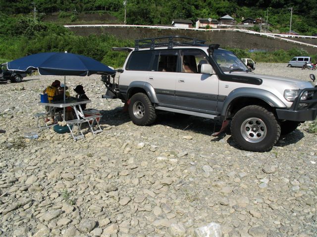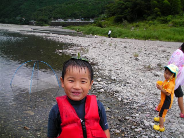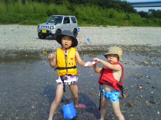 うどんツアーから帰ってきたらうちのチビたちが待ち構えていて・・遊ぼう・・・って!何がしたいか聞くと、1号がバトミントン、2号・・自転車3号・・昼寝をしていないためお怒りこの暑さで、外は・・・・・・・川遊びを提案して、それで決定!(3号怒ったまま床で)1号、2号を連れて川へ・・・いつもの場所が増水にて沈没(本流だけじゃないので、安心だったのに~)対岸へ降りて、あまり人のいない場所へん~ジムニ君の出番がやっとキター!もしはまってしまってもジムニ君なら助けてもらいやすいし、自分でも何とかなりそうだなんて考えながら、無事到着!それにしても暑い!!しかし川は・・・・う~~寒い2号の水かけに飛び上がりそうに・・・・その様子に面白がって、1号も参戦・・・・もちろん早々に川から上がりましたおやつのポッキーの奪い合いです。これからは、休日は朝マズメ勝負の、昼間は川原でかな?本当は、お船で海水浴が・・・・・・・しかし嫁が・・・・・・・・・トイレがない、酔う・・・・・なんて言うだろうしなぁ~