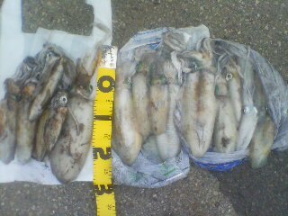 先日の釣果の良かった先輩から出撃のお誘いが前日の天気予報では曇りのち雨と書いていたと思ったのだが・・とりあえずいつもの場所へと出撃・・・・・しかし、以前釣果のあった場所ではことごとく玉砕・・・しかも雨が(途中土砂降り)・・・・・・・・・・いつも叩かないところで先輩が一杯(500gぐらい)そして、顔射を本人、顔の墨は気付いてませんでした。(写真ではあまりわかりませんが、後ろの風景で土砂降りの感じが・・)西の方を叩いている船からは、いい釣果の連絡が結局、11時ぐらいまで叩いて結果、先輩7杯・・・連れが1杯・・・・・・・・・・・・・・・・・・・・・・僕は・・・・・・・・・・・・・・ボ・・ボ・・・・・ボウズだ!!!!そういえばクーラーに・・・・・・・ガシラとネイリのチビが(ジグ投げました・・・)サビキにオジサン?海ニゴイ?が2匹かかりましたが食べたことないので海へ 今回の釣行でイグジストがドラグの調整がきかなくなって修理へ、ジギング用のリールもハンドルが取れるハプニングがこれも修理へ・・・・・・・・・・・・・・・今度は何が・・・・・・・・・・・・・・・・・・・・・・・・・・・・・・