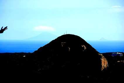 結局その日、下田富士の山頂から、目の前にそびえる寝姿山の頭の部分に相当する武山の両サイドの海上はるか遠くに、左に富士山と見紛うばかりの美しい利島と、右に小さい三角形の鵜渡根島を見つけます。こちらの写真ですね。