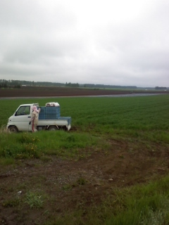 長いも畑のポール立ての仕事です 霧雨がひどくなりそう