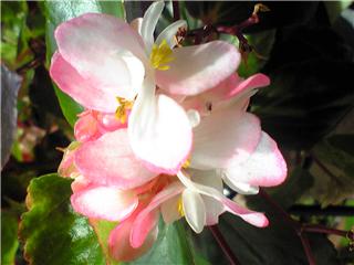 ベゴニアの花です。今頃が一番きれいですが、暑いのは嫌いです、これからは室内か光の当たらないとこでないと枯れてしまいます。デリケートでかわいい花です。