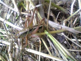 1cmぐらいのわらみたいなものをアリが運んでいました。写真でも小さすぎてわかりません。真ん中の白いものの先端に1~2ミリぐらいの小さなアリが運んでいました。ありの巣を作っているのでしょう。自分の10倍もあろうかというものを運んでいます。最初何が動いているかわかりませんでした。どこにでもいるようですがわかりませんでした。これで3cmぐらいに接近して撮影です。今日はアリとキリギリスでした。