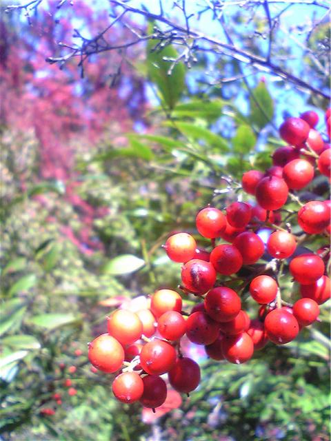 秋、実、南天、:秋の実、南天、あとはよくわからないものです。鳥のえさになっているようです。食べられた後があります。