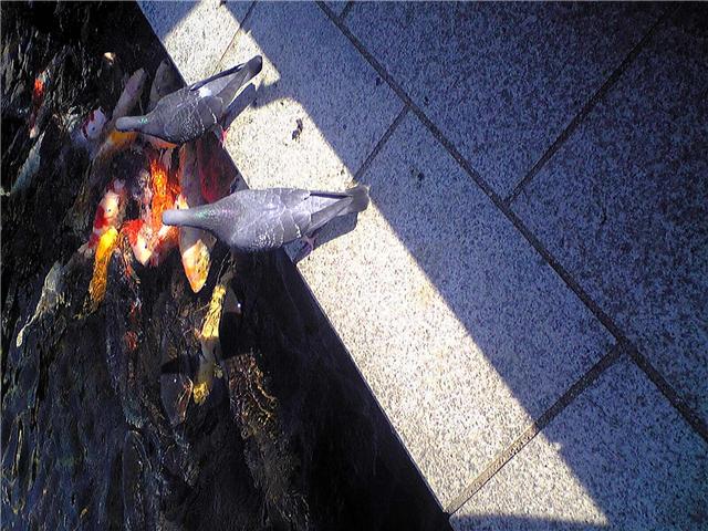 とり、ユリカモメ:ユリカモメの鯉との餌の取り合い。この時期すごく増えます。海が近いのでこんなとこにいるのでしょう。