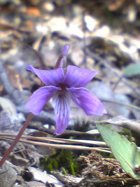 はな , すみれ , たちつぼすみれ:スミレが山で咲いていました。庭ではタチツボスミレが咲いていました。大きさはすごく違い、野生のすみれは小さい。タチツボスミレ V. grypoceras A. Gray 茎は地中で短いが、成長すると茎は地表に伸びて立ち上がる。葉は始めは根出するが、茎が伸びると葉もそこにつくようになり、丸っこいハート形。花は薄紫。 スミレ Viola mandshurica W. Becker 茎は地中で短く、立ち上がらない。葉はすべて根出し、細長い矛型。花は濃い紫。