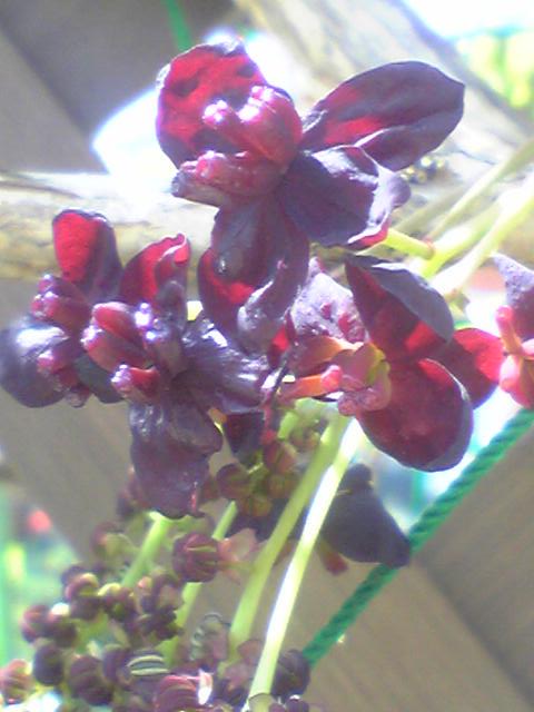はな 赤青黄色 みつばあけび:ふと庭を見るとにぎやかに生っています。もんしろちょうも飛んできて赤青黄色の花たちも咲いています。そんな中ミツバアケビは3枚の花びらが4枚ついたものもあり、これは珍しく幸せな気分になれます。