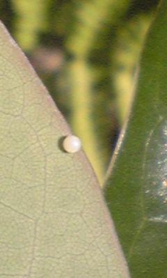 アオスジアゲハが飛んできて、目の前で産卵していきました。新しい命の誕生です。幼虫までは見守れますが、小鳥が来たり、寄生虫や病原菌などにやられたりして蛹になるのは1頭か2頭でしょう。もう少し多ければ良いですが、どこかへ飛んで言ってしまいました。それにしても、狙われやすい位置に産んでいきました。おっちょこちょいの母親のようです。葉の裏側の見えない位置に産んだつもりで、落ちたのでしょうか?触ったら、細菌など感染するのでこのままにします。