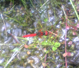 よくわかりにくいけれど、真中のあたりにおしりを水面につけて産卵する猩々トンボのメス。メスは黄色い色なんですね。普段は林にいてめったに見ません。オスが時々ペアリングしに来ます。