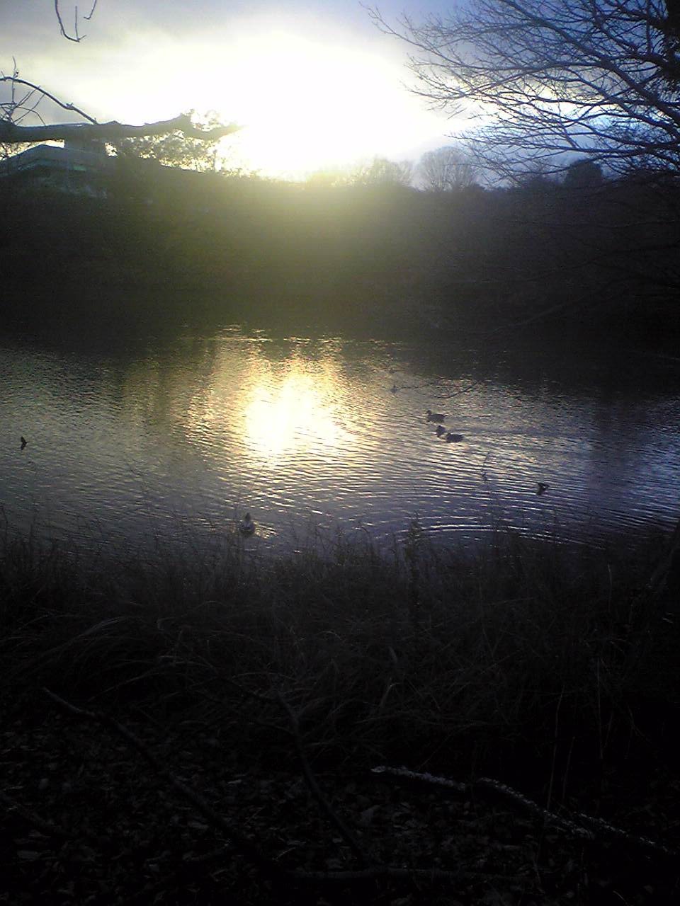 夕日に向かって飛ぶカモ。最近急に、陽が沈むのが遅くなってきている。ブラック鴨もいいかもね。この鴨は餌に寄ってこないと思う。鴨葱にはできない。
