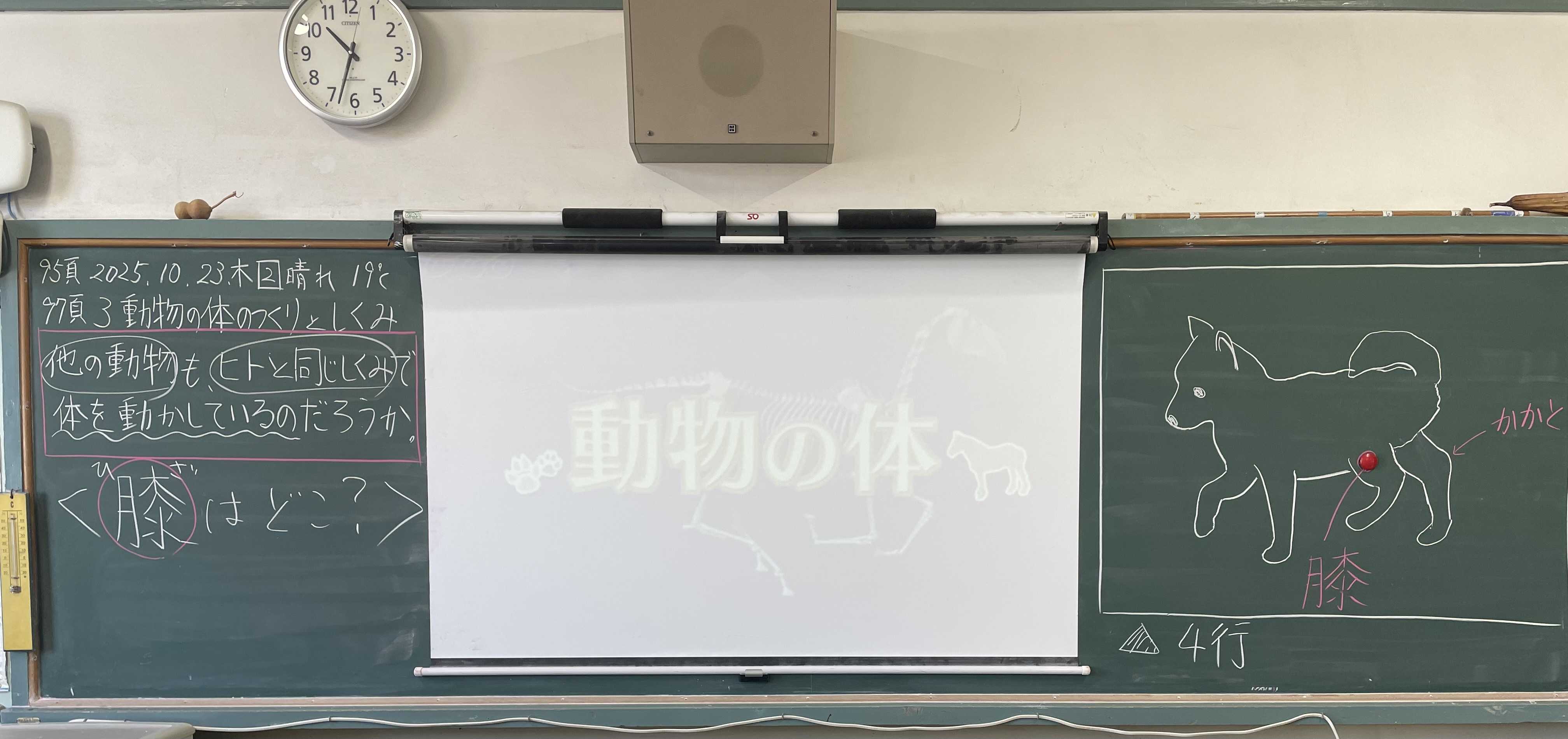 4年生の理科授業「ヒトの体のつくりと運動」の第4回目は「動物の体のつくりとしくみ」。イヌの膝はどこにあるかを問うて、NHK動画「動物の体」を視聴。