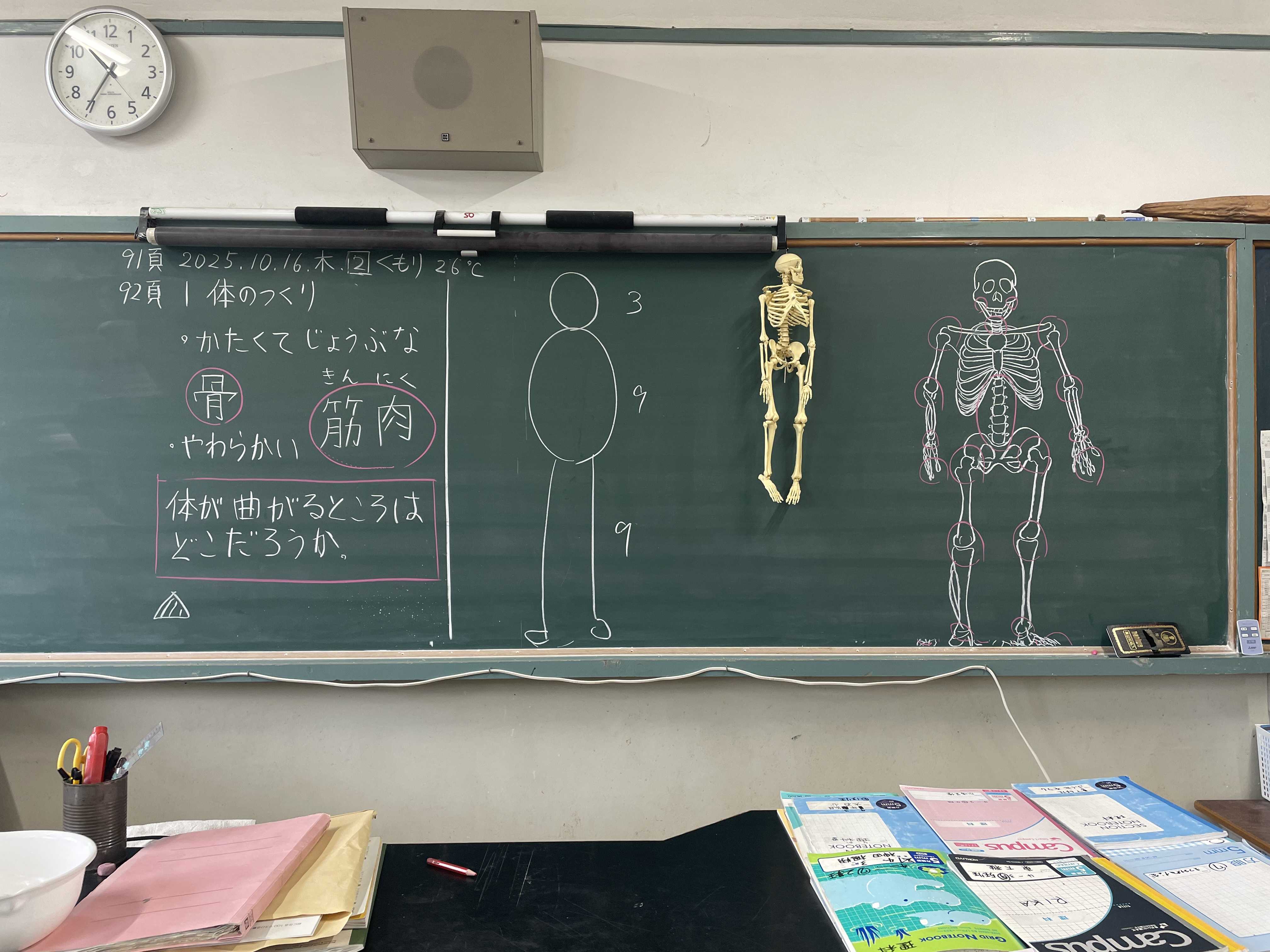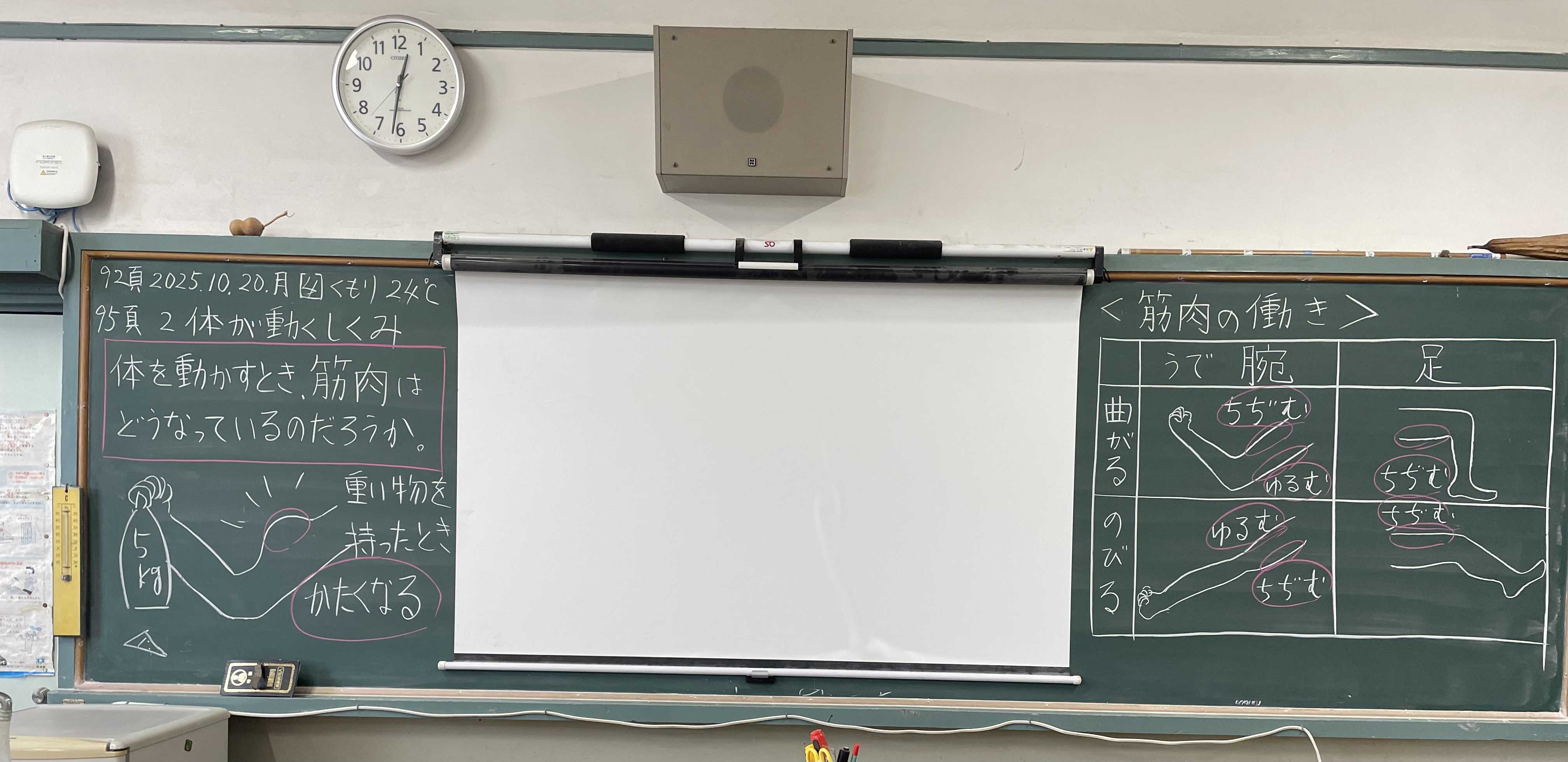 授業「体が動くしくみ」2025.10.20.月 4年生の理科授業「ヒトの体のつくりと運動」の第3回目は「〈観察2〉体が動くしくみ」。 先に大枠の板書書写を行う。 次に見本を示しつつ各自で腕や足の筋肉の変化を確認させ結果を板書書写。 最後に10分間のNHK動画「人の体が動くのは?」を視聴。