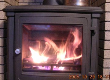 部屋の明かりを消し、薪ストーブの前で炎の舞いを見つつしばし酒を飲む。