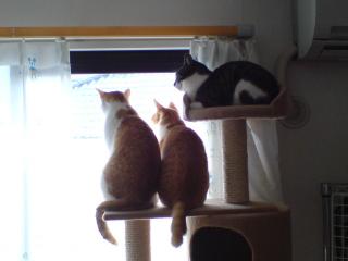 きのー食べに行ったラーメン屋さんは夜しかやってないので食べ終わった頃にはすでに22時30分それでも、ぜんぜんしゃべり足りないという事で近場のファミレスで別腹をしたw(*´Д`)<ベルバラ、ベルバラ話は尽きることなく、何倍も飲み物をおかわりし気づくとすでに0時過ぎ・・・一人電車で来ていたので、もちろん終電も終わってるこのまま車で送って行くのが普通なのだがなにせ送ってから自宅に戻ろうと思うと3時間コースそんなわけで、問答無用で自宅に拉致した(´∀`)それでもラーメン屋近くのファミレスから帰宅したのはAM3時狭い我が家なので、コタツを片付けたりしてすぐには寝れない友人に和室で寝てもらい、自分たちはニャンズの居る洋室でとうぜん、枕元にはキャットタワーニャンズは遠慮することなく走りこんで飛び乗ったりパパンの枕元に飛び降りてきたりwちょっとすると、アヤが枕元に来てニャーニャートイレ使ったよと知らせに来るもうろうとする中、トイレのブツを片付け布団へまたちょっとすると、今度はしいが枕元に自分もトイレ使ったと知らせに来たらしいそして、また布団に入ってちょっとすると今度は、「ごはーん ごはーん」と大合唱ヨロヨロと起きて、ニャンズにご飯をあげる楽しかったけど、ハードな週末だったもちろんすべてパパンがw私は、朝まで布団に入ったままでした(´∀`)朝からさっそく友人に遊んでもらって、満足げなニャンズ【 3匹仲良くお見送り 】また来てねー♪。.。:+* ゚ ゜゚ *+:。.。:+* ゚ ゜゚ *+:。.。.。:+* ゚ ゜゚ *+:。.。:+* ゚ ゜゚*+:。.。他にも可愛いネコ達がいっぱいなのはコチラ どちらもランキングにエントリーしています。1日1回ずつ有効です。
