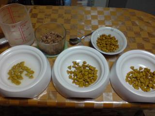 昨日は、雷が鳴ったり数分だけ雨が降ったり夜には地震が起きたり、なんか変な一日だった暑い日が続く中、ニャンズは今日も食欲旺盛(´∀`)まぁ、エアコンで調整しているわけですがニャンズのご飯、朝は手早くドライのみみんなエコノミーファウンテンを使ってくれているから水分補給もバッチリですъ(`ー゜)夜は、ウェットを併用して、食感と食べる楽しみを作っていますこれが3匹分の夜ご飯それぞれの年齢と体重に合わせた量を測ってそこに170gの猫缶1/2を三等分するアヤとななは、ドライとウェットを混ぜた状態で食べてくれるけどしいは、ちょっと手間がかかる一緒にした状態だとウェットだけ食べて食べ足りなくても、食べるのを止めてしまい後でお腹が空いたと騒ぐので、ドライのみの皿とペースト状にしたドライとウェットを混ぜた皿と分けているまず、適量のドライの半分をお湯でふやかしてこのドライは、水分の吸収が早くてすぐほぐれるので消化がよさそうですスプーンで簡単にペースト状になっちゃいますまぜまぜして、出来上がりみんな夢中で食べてます(´∀`)左下がしいなんだけど、ななより大きい夜ご飯のときは、出来る限り食べ終わるまで側についている食べている様子で健康状態を見たり先に食べ終わった子が、ほかの子のを横取りして食べ過ぎないように見張っていますwいつも触らせてくれないなながこの時ばかりは触らせてくれるのでそんな楽しみもあったり毎日繰り返される時間だけど毎日、食べている様子をみながら毎日、いろんな事を考えている時間でもある 。.。:+* ゚ ゜゚ *+:。.。:+* ゚ ゜゚ *+:。.。.。:+* ゚ ゜゚ *+:。.。:+* ゚ ゜゚*+:。.。他にも可愛いネコ達がいっぱいなのはコチラ どちらもランキングにエントリーしています。1日1回ずつ有効です。