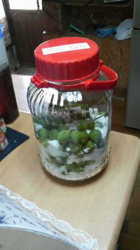 昼御飯を食べて、休憩してから、収穫した梅のヘタを取り、水洗いして、傷がひどい部分は取り除き、砂糖と交互に梅を入れて、準備完了です(^-^)