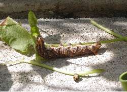 今日も埼玉は暑いです~いつになったら涼しくなるのかなと思いながら、洗濯物は乾くのでまぁ、いいかなと思ったりしています夕方には娘が修学旅行から帰ってきます日光の色々な話・・楽しみに待つことにしますお天気今日も暑い~植物♪ベビーサンローズを挿し芽しました食べ物今日は給食試食会でひよこ豆のナンカレー♪その他★今日は娘が修学旅行から帰ってくるその他2☆楽しかったかな~?今日のできごと昨夜も今夜もカレーです・・最近花がたくさん咲き始めたうちのあさがおですがある朝、急に葉っぱが減っていることに気がつきました地面にはコロコロのフンがたくさん・・見ると、茎に丸々と太ったいもむしが5匹もくっついていました(^^;ゞ調べてみたらエビガラスズメという蛾の幼虫らしいことがわかりました茶色いのや黄緑色で人の指ほどもありますもりもり葉っぱを食べて取ろうとすると口から緑色の液を出します朝顔につく芋虫はめずらしいなと思ったのですがスズメガの仲間でもヒルガオ科の植物につくのはこの幼虫だけらしいですあわてて茎ごととって隔離しましたが・・すでに朝顔は半分丸坊主です(^^;ゞそれでも今のところ花だけはがんばって咲いていますいもむしのページはこちら・・蝶や蛾、他の虫がきれいに並んでいる、女の人の見やすいページです♪