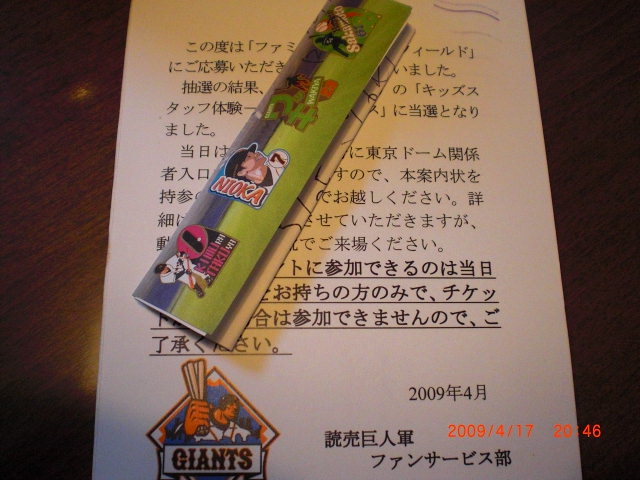 本日も熱戦が繰り広げられていますが、21時7分現在、抑えは誰が投げるのがきがきではありません。そんな中、今年から日曜日のデーゲーム時に抽選で参加できるファミリー・オープンフィールド「キッズスタッフ体験」(小学生対象)に当選しちゃいました。もちろん私の子供の分です。親としては子供をビデオや写真に撮ったりしたいのですが、子供が参加している間はどこで待機しているのでしょうか!?