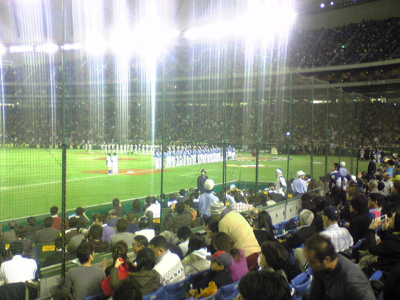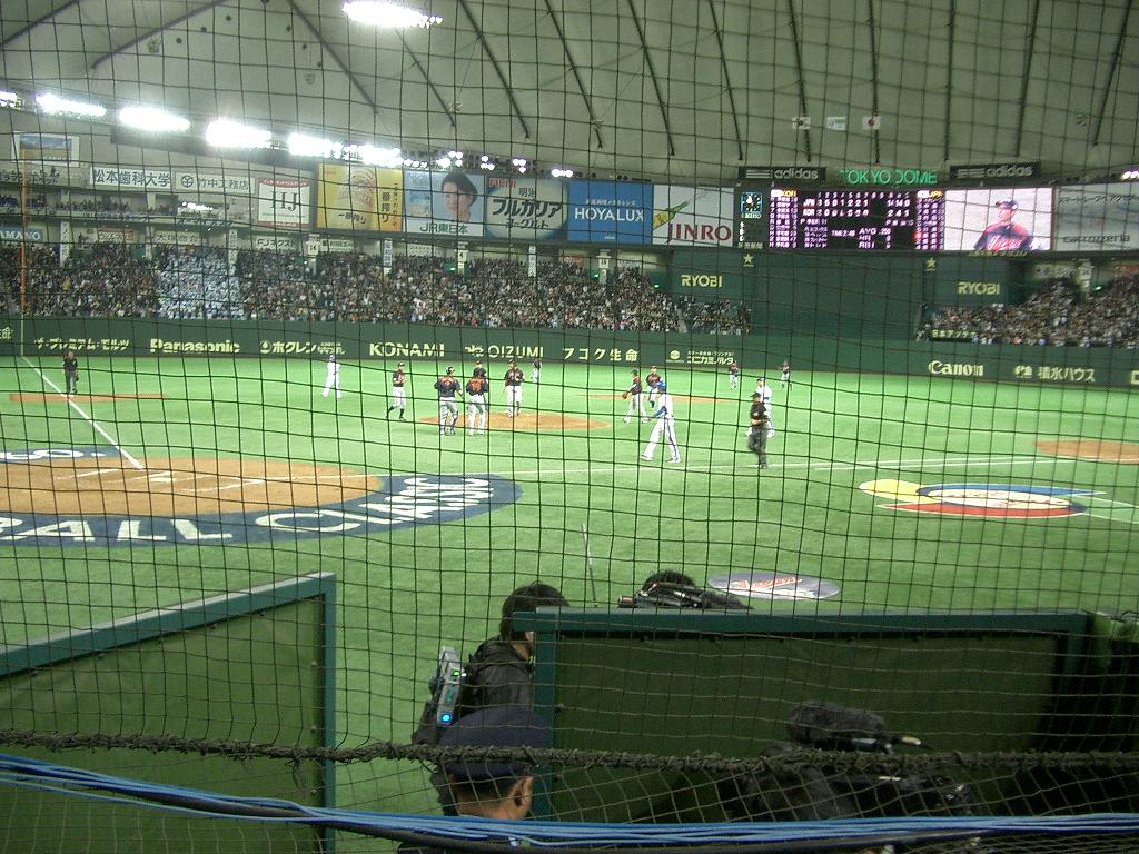 いってきました。WBC韓国戦パート2少ないチャンスをものにしたチームが勝利しました。悔しいです。。。日本代表は攻撃面はいまいちでしたが、守備面では普段なかなかみれないプレーの連発で、観客を楽しましてくれました。特に城島の2塁走者へのスローやノーアウト2塁3塁の場面はおおいに盛り上がりました。ただ結果は紙一重でした。ラッキーだったのか?レベルの差か?(負けといてレベルの差は韓国に失礼?!)当日は生観戦の予定はありませんでしたが、急遽予定していたことがキャンセルになり、どうしてもいきた病にかかってしまいました。公式チケット販売は3塁S席(16000円)3塁A席(12000円)がわずかに残っていましたが、いずれもグラウンドからはるか遠く、価格に値する座席ではありません。ヤフオクものぞきましたが、希望する座席はとても高価で買えません。主催者が保持しているチケットが開放されることを強く信じ、待つしかないと、、、、半ばあきらめ気味でした。(アメリカMLBでは当日の試合前に超超超良席が販売されることがたまにあるのです。)16時30分のことでした!!!!3塁側でしたが限りなくS席にちかいA席1桁列目の座席がでてきたのです。超良席ではありませんでしたが即購入をし無事に生観戦をすることができました。2009年WBC東京ラウンド。すごく良い思い出になりました。今は気が抜けてボーっとしています。本当に楽しかったです。おっと、、、これからアメリカラウンドもありますね!!!写真は急遽生観戦だったので、携帯で撮りました。