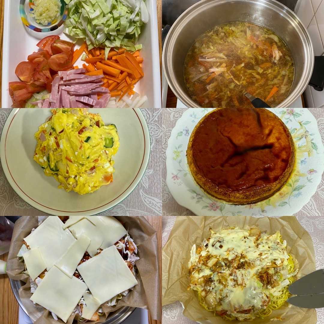 ○段重ね料理 1、和風ミネストローネ お鍋に油を入れ みじん切りのニンニク パセリ トマト ベーコンを炒め、キャベツ ダイコン ニンジン セロリ(冷蔵庫の野菜なんでも)入れ少し炒め 水を入れる。最後にツユの素を入れ味を整える。 2、ポテトサラダ 蒸し器にじゃがいも ニンジン 玉子を入れ、野菜が柔らかくなったら、取り出して潰し、玉子も殻を剥き潰して、キュウリ ハムを入れ、オイル 酢 マヨネーズ 胡椒で味を整える。 3、プリンケーキ 前もってキャラメルを作った容器に 玉子3個 砂糖70g 牛乳300ccをよく混ぜて入れ、上にケーキ種を入れてポテトサラダの上で20分蒸す ○焼きそばピザ フライパンにクッキングシートを敷き、焼きそば、キャベツ、ボイル豚肉 キムチ カレー粉 やきそばソース マヨネーズ チーズ を重ねて、蓋をして15〜20分焼く よつ葉シュレッドチーズ(ミックスチーズ)1kg×2袋楽天で購入