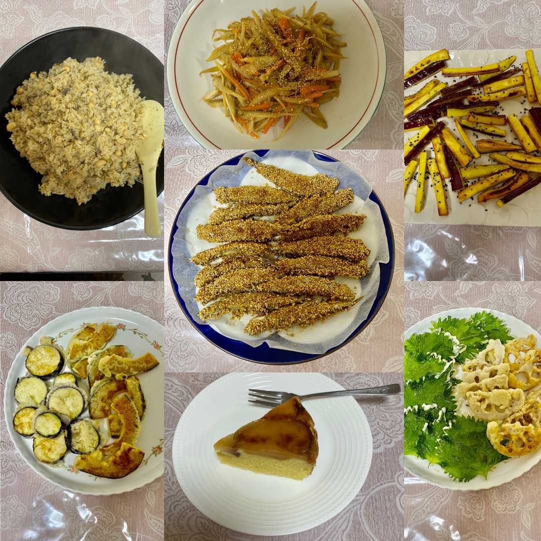 同じフライパンで、大葉、レンコン、ナス、かぼちゃをスライスして、少ない油で揚げる。