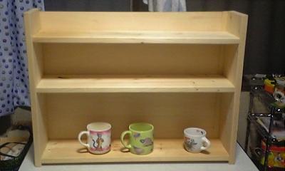 昨日台所でご飯食べててなんか棚があったら片付くのにな~って思ってて、そー言えば前に本棚作ったときの残りの材木があったのを思い出したので、1時間??くらいで作れたかな?