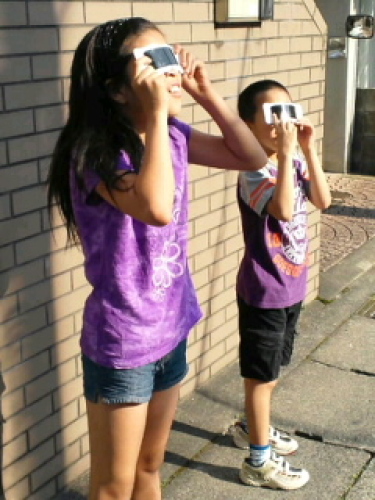 天体好きな長男 ・・・ とうぜん、金環日食ははずせません!「ママ~~~ ゴーグルどこ? 」 ・・・ っと長男、、、 まだ6時ですよ。。。観察用ゴーグルは玄関にスタンバイ中 、、、 長男は家を飛び出して行きました。。。「ぼくも見る~~~」 ・・・ 二男も飛び出して行きました。。。 ちょっと君、、、何見るかわかってんの??? ・・・ うん!太陽 !!! あ、、、わかってんのね、、、 じゃあ観察用ゴーグル持っていってください。。。「 は~~~い 」 ごきげんで出て行きました。。。 君、天体 興味あったけ??? すぐに帰って来ました。 「 なんも見えへん 」 長男のテンションが下がっております↓そう? ・・・ 見に行ってみると、、、 東の空にはブアツイ雲が!!! これでは見えないなあ~ ・・・ でも、南の空はスッキリ晴れています。。。まあ とりあえず、ごはん食べときいな! リングになるまで まだ 1時間あるし。。。「 そうするー 」 ↓↓↓ ・・・ テンション 低すぎーーー 。。。 とりあえず ゴミ出しに外へ出てみると、、、雲の合間に太陽が出ています! 「今、見えそうやで !!! 」「なにが~~~」っと長男 ・・・ 太陽やんか !!! 「ほんまに~~~」いいから早く出てきいな! また隠れるやんか!!! 「 お! 見えた!!! 」どれどれ私も見てみよう 、、、 ん??? どれ? あの 小っちゃ~~いの?小指の爪くらいのオレンジの点が見えます。。。 確かに、、、右上が欠けてる、、、う~~~ん ・・・ 迫力ないなあー 、、、 また後で見よっか。。。 長女を起こし、 朝ごはんを食べさせてると、、、 どんどん外が明るくなって来ました!6時40分 、、、 なんかすっごく明るいぞ! 「 お兄ちゃん! 晴れてるんじゃない?」「ん! ほんまや、、、明るいな! ちょっと見てみる!」 ご機嫌になりました。。。 「ママ はっきり見える~~ すごいで~~~」 そう? じゃあ私も見よっと。。。 見てみると、、、 今度は500円玉大の大きさで迫力満点! くっきり見えます!長女&二男も来ました! おや? 三男は??? ・・・ 爆睡中です。。。三男を起こし、 小学生組はみんなで学校の用意。。。 パパ&四男も準備OK!二男は3分おき くらいに外に太陽を見に行ってます。。。 えらい気に入ったな。。。 7時10分 ・・・ よし! そろそろ本格的に 金環日食 を見るぞ !!! かなり細い三日月状態、、、 「すっごーい! お月さまみた~~い」騒いでいると、、、 斜向かいのお兄ちゃんが窓から顔を出しました。。。「おはようございま~す。 ごめんなさいね、、、朝から騒がしくて。。。」お兄ちゃんはペコっと頭を下げ、、、 窓えお閉めてしまいました。。。うるさかったかしら、、、 起しちゃった???すると、、、 お兄ちゃんが外へ出てきました! え??? どうしはったん???「どんな感じですか?」 ・・・ どうやら 観察グッズは持ってないけど気になって出てきたようです。。。 ゴーグルを渡して、、、 いろいろ騒いでいると、、、 今度は2件隣りのご家族が!そこは長男のクラスメイトのお家、、、 あ!持ってはる~~~ 見せてもらって良い?はいどうぞ。。。 どんどん人が増えていきます!すると ・・・ マスク型の日食メガネを持っている方が登場 !!! マスク型の日食メガネを、みんなで回し見て 大騒ぎ!・・・ 仲の良い町内です。。。 すこし離れた場所で観察中の知り合いを見つけて合流。。。そこでも騒いでいると、、、 近くのアパートからまたまた長男のクラスメイト家族が!そこも観察グッズがないけど気になって でてきたそうです。。。 話していると遠くから、知らないおばあさんが 「見せて~~~」 って走ってこられました。。。あたりを見回すと、、、 あちこちにたくさんの人が!!! そこで、チョウド太陽がリング状に! ・・・ キレイに空も晴れ くっきり見えてます! いや~~~ キレイです! 晴れてよかった。。。 半分あきらめてましたから。。。 子供達もご機嫌です! 「ママ、すごかった!!!」 っと三男。。。なにがすごいか わかってるのかしら??? ・・・ 微妙。。。 まあ良いけど。。。 家の前にもどると、すっごい人だかりです。。。 お父さん方もたくさん出てきてます!さんざん観察して飽きてきた子供達はお父さん方にゴーグルを貸してあげてました。。。 四男もゴーグルが気になる様子、、、 あなたはちょこっとだけね! キャッ キャッ ・・・ よろこんでおります! 太陽はみてませんが。。。パパはそろそろ仕事の時間 、、、 というか、、、もう遅刻ですよ? 朝6時から約2時間 、、、 かなり楽しめました。。。 子供達はキット 大人になっても、今日のことは覚えてるんだろうなあ~~~そんな気がします。。。 一枚300円で買ったゴーグル 、、、 無駄にならずに良かった。。。次は金星通過だったかしら??? その時も まだ長男は 天体好きなのかしら???コロコロと興味のかわる長女と違って、 長男は大丈夫か。。。ゴーグルは大事にしまっておこっと。。。 大事に仕舞い込んで 失くしそうやけど。。。
