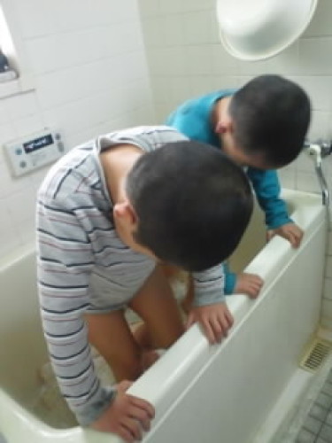 GW & 家庭訪問もおわりちょこっと休憩、、、 疲れる2週間でした。。。 明日は学校で 『そうめん流し』 準備前にGW中のことを書いちゃおっと! GW中は家庭訪問のための大掃除、、、 子供達は連日の片づけにグッタリ。。。普通の片づけに飽きてきたようなので、、、 他の事をさせてみよう!チョウド、洗濯に使ったお風呂の残り湯も良い具合に残ってるし、、、 浴そうに5cmほど残っている残り湯に 洗剤を突っ込み少しかき混ぜた後、、、 片づけに飽きて遊び始めた 二男&三男 をお呼び出し。。。「なにすんの~ もう疲れた~~~」 ってまだ1時間しか片づけてませんが。。。「そこのお布団もってきてくださ~い」 「は~~~い ↓ 」 テンション低いな。。。「下の服脱いで! お風呂に入る!」 「え !!! なんで???」 チョット元気に!「お布団洗うから~~~」 「え! 僕が???」 そうです! あなた達が !!! お布団を洗剤入りの残り湯に放り込み、、、 そこに二男&三男も放り込みました!がんばって踏んでおります! 「ママ! これおもしろい !!!」 やる気になったようです!そこに長女が登場!!! 「わたしもやりたいな、、、」 ・・・ やっぱり。。。 じゃあ、、、 だいだい踏めたらチビ達を浴そうから出して、足洗ってやって!あなたは浴そうの栓を抜いてからチビ達と同じようにお布団踏んでね!「え!栓抜くの??? なんで???」 今度はお布団が吸った水を踏んで抜くんです!まあいいからやっといて! 「は~~い」 ・・・ 後は長女に任せておこう。。。 長女&二男&三男 はその後お風呂場で楽しそうに遊んでました。。。もちろん、布団を踏みながら。。。 その間に、私&長男は部屋の片づけ、、、邪魔が入らないのではかどります! なんとか終了~~~ お疲れ様です!だいたいの水を抜いたお布団はそのまま洗濯機で軽くすすぎと脱水をかけ、物干しへ! ~~~ 完了 ~~~ あーーー疲れた。。。 「ママ! もっと洗いたい~~~」っと長女、、、 もう疲れたんですが。。。外で靴でも洗ってたら??? ベビーバス出したげるし、、、 「うん、洗う~~~」 元気ね。。。 長女&二男、三男は ガレージで靴洗いを始めました。。。がんばってね~~~ 長男と私は、、、 今日は片づけ終了! おやつタイムです! で、、、 四男は ???どこぞに電話をかけております ・・・ さいきん電話がお気に入り。。。受話器を持って 耳 というか 頭 にあてて、なにやら 声を出しております。。。 誰に電話してるのかしら??? 受話器を戻したり、とったり、、、何度も繰り返してます! 楽しそうですが、、、 そろそろ ピーーーー !!! って鳴るよ~~~ ! 最近、よく 電話が ピーーーー って鳴っております。。。 犯人は四男です。。。 音が鳴ると あわてて受話器を放り投げ、、、 他の部屋へ行き 、 なにごともなかったように遊んでおります。。。 僕のせいで鳴ったんちゃうし、、、 僕かんけいないし、、、 って感じです。。。 まあ、いいんですが、、、 受話器であそんだら、元にもどそうね。。。 そろそろ 『流しそうめん』の準備しなくっちゃ!!! 天気もよさそうだし、、、 なかなか楽しめそうです! おっきなお椀もって行こ。。。
