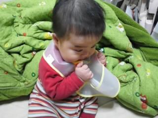 12月は忙しくて、なかなか時間がとれないな~。。。 写真も撮ってる余裕がない!はやくお正月こないかな~ 。。。 ゆっくり休みたいな。。。12月12日(月)最近、食べ物にかなり反応するようになった四男 ・・・ 落ち着いて食べてられない !!!ので ・・・ 《 おやつ 》 を食べさせることにしました。。。 ※期間限定 全国一律送料180円※ 【特売セール】 ピジョン ベビーおやつ 元気アップカルシウム 小魚せんべい《 はじめておやつ 》は、これにしました! 《 小魚せんべい 》 どうかな???「ばりっ !!! ぼりっ !!! ばり、ばりっ 、、、」 ・・・ え~っと、、、なんてワイルドな食べっぷり ・・・ 想像と違う !!! もっとチュパチュパ味わって!あ! ・・・ なくなっちゃいました。。。 すぐにおかわりの催促、、、もう! ・・・ 早すぎよ~ 、、、 ママはまだ食べ終わってないよー。。。「私があげるー」 プチママ長女が抱っこして、連れ去りました。。。こんどは落ち着いて食べてるようです。。。 ますます おでぶちゃん になりそうね。。。 四男は 《 ずりばい 》 もはやくなってきました! なんでも触りに行きます!長女が コロコロで掃除中も、邪魔しに行きます! ・・・ ガウッ ガウッ「それ、貸してよ!」 ・・・ ってところでしょうか、、、 どこまでも追いかけます! 根負けした長女から、 コロコロ をゲット !!! ・・・ ご機嫌です!12月19日(月)スムーズに動けるようになると ・・・ ちゃんと座ってられなくなりました。。。 ちょっと! ・・・ いま、食事中ですよ !!! ・・・ だれ だれ~ ・・・ そろそろ椅子を出さないとダメか。。。今日は《 風邪ひき 》の三男が家にいます! ・・・ 退屈なので、、、DSをはじめました!四男も夢中! ・・・ ピッタリひっついてます。。。 そーっと近づくと、、、 ・・・ なによっ !!! ・・・ って感じで見られちゃいました。。。 こわっ !!! その後も三男にぴったり寄り添っております。。。 三男は気にせずゲームに没頭。。。あ、小学生達が帰ってきた! ・・・ 「 ママ、おやつ~ 」 はい! 適当に どうぞ!とうぜん、四男も寄って来ます! ・・・ 「ぼくのは~」って感じにキョロキョロ。。。「そうちゃん、にもあげていい?」 ・・・ 長女が、エイセイボーロをお口に ポイッご機嫌で食べてます! ・・・ おいしそうね。。。 食べ終わったあとも空の袋をはなしません !!! 振り回して笑っております。。。あ~あ、、、年明けの8カ月検診でも《 おでぶちゃん 》っていわれるね、、、キット。。最近は、赤ちゃん用の《 ちゃんちゃんこ 》を着て、ますますコロコロに !!! かわいいし、、、 いいんだけど ・・・ もう ママ、 長時間の抱っこはムリです。。。