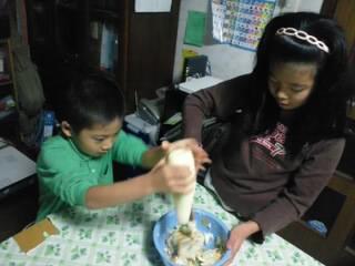 11月4日(金)に柿狩り遠足に行った三男 ・・・ 大きな柿を2個持って帰ってきました!でも、とーっても《青》かったので、、、ずーっとテーブルの上にお座り状態。。。「ママ~ 僕の柿はやく食べようよー」・・・三男が毎日のように催促。。。だって~、、、青いし~、、、おいしくなってからね! 「僕の柿、おいしいもん!」 はい、すみません。。。 おいしいのはわかってます。。。三男の催促にまけず・・・なんとか食べごろまで座りつづけた 《柿》、、、先日やーっと食べました! 11月20日です ・・・ 長かった。。。一つは普通にむいて、、、もうひとつは? 《柿入りマカロニサラダ》で !!!良くブログに遊びに来てくれる 《 087はな 》さんのレシピです! ( レシピの貼り付け方がわからないわ・・・087はなさん、、、ごめんなさい。。。)三男&長女で作ってます! 子供でも、料理苦手な私でも簡単につくれます!ちょっと~ マヨネーズ入れすぎよー !!! なんとか完成~キレイな器に移して、おいしそうな写真にしたかったのですが、、、子供達は、、、さっさとボールからとりわけ食べ始めちゃいました。。。 087はなさん ・・・ せっかくのアイデア料理をこんな写真でごめんなさい。。。一瞬でなくなっちゃいました! 柿の甘さがほんのりと、、、すーっごく食べやすいです!柿嫌いの長男は、何も知らずに食べた後・・・「僕の柿おいしい?」っと三男に聞かれ?「柿? 食べてへんで???」っといってました。。。 入ってますよー。。。「え! これ柿~」っとおどろいてました。。。 「 でもおかわり !!! 」最後は長男がさらえて終了。。。 とーってもおいしかったです。。。《 087はな 》さん、いつもいおいしいレシピをありがとうございます。。。ブログに貼れなくてごめんなさい。。。 ブログのシステム、、、まだまだ使いこなせておりません。。。 勉強します。。。