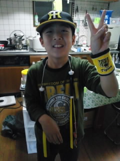 長男は昨日に行った《 阪神タイガースファン感謝デー 》の余韻が抜けず ・・・今日もハイテンション。。。 いつまでそのカッコしてんの! 嬉しくて仕方ない様子!肩にかけてる《 ヌンチャクバット》に、四男が興味を持ったことを感じて、、、意地悪をはじめました。。。 四男の目の前に ブ~ラブ~ラ 当然、四男は、、、取ろうと思ってがんばります! 必死です !!! ・・・ もう、かわいそうでしょ!「は~い」さんざん意地悪してご満悦の長男は、、、ヌンチャクバットを四男へ。。。何回つかんでも引っ張れなかったのが、急に取れたので、、、四男はビックリ。。。 ・・・ え! いいの??? ・・・ って感じで長男を見てます。。。ほら !!! 意地悪してたんバレてるやん! ・・・ 四男に気をつかわせるなんて。。。「 遊んでいいよ! 」っと長男が笑顔で言うと ・・・ 四男の表情が変わりました! にへら ~~ か、 顔、、、ゆるみすぎでしょ !!! よっぽど嬉しかったのね! 長男も 「かわいー、、、よろこんでるー」っと笑顔。。。 嬉しそうです。。。ひとしきり《 ヌンチャクバット》っで遊ぶと、、、今度は帽子が気になった様子。。。長男の方へゆーくり動きだしました! ヌンチャクバットは? しっかり持ってます!長男の様子をうかがいながら ・・・ そろそろーっと帽子に手を伸ばします。。。これも、いいでしょ !!! って感じです。。。 長男も、もちろん気づいてます!長男は、、、また意地悪心を起こし ・・・ 「これは、 ダメー !!! 」って帽子を自分の背中に隠すと … フガー !!! … 出た! 四男の荒息 !!!っと思った瞬間 !!! 四男は長男に向かって ダーーーイブ !!! 「うわ !!! と、飛んだー !!! 」 長男は思わず後ずさり、、、 四男は? 長男をガン見して「 フガ、フガ !!! 」 《 貸してよ 》の、猛アピール !!!「どこやったの! はやく出しいさー」って目が言ってる。。。《 ヌンチャクバット 》 を借りた時の謙虚さはどこに??? ・・・ こわすぎです!結局、催促に負け、、、長男は帽子も四男に取られちゃいました。。。 苦笑いです! 「あービックリした! もう、おもしろすぎるわー 」 長男はこれからも意地悪しそう。生後7カ月なのに ・・・ なんか、、、こちらの想像以上に物事を理解してそう。。。 5人目になると、こんなに理解力が早く育つのかしら。。。 チョットビックリ !!!おもしろいし、、、いいんだけど。。。 今日は良い顔いーっぱい見れたわ。。。