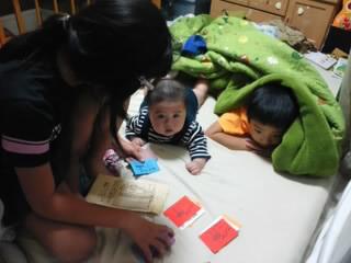 今月も《 折り紙 》折ってます! 《 鬼 》 ・・・ いちおう簡単な折り方なんだけど、角とキバのバランスがむずかしい! わたしは苦手。。。《 龍 》 ・・・ ちょいムズ。 頭の部分が細かい! 四分の一サイズで折ってるせい? でも、いろんな格好にできておもしろい。《 ハートの指輪 》・・・ 折り数は多いけど、失敗しにくいです。普通の難しさ。。。 キレイにできるので作りがいがあります!今月の折り紙はこの本から抜粋!【送料無料】親子で楽しむおりがみずかん 今、一番のお気に入りの折り方本です! かわいい折り方がたくさん載ってます!今月も、もらった子達が喜んでくれるかな~ 楽しみ~。。。昨日、長男&長女は《 書き初め 》をしました!《 ゆき 》 が長女 ・・・ 習ってもいないのに、なかなか上手。。。 この間、学校で書いた《 にじ 》が入選したって通知がきました! なんで書けるの? 不思議。。。《 お正月 》 が長男 ・・・ 習っていませんって感じ〇出しです! でもまあ頑張りました! ただ、、、小筆がキチンと使えません! あまりの下手さに怒っちゃいました!かなり書きなおさせ ・・・ やっと完成した一品、、、お兄さん、お疲れ様。。。書いた《 書き初め 》は会社にもっていくとお菓子くれたうえ店に飾ってくれます!私の店は隣が習字教室! 昨日が今年初めての授業だったようで、、、子供達が連れだって持って来てくれました。。。 貼る場所なくなってきたけど、、、店長どうするの???《 怒らない年に! 》 ・・・ 6日で怒っちゃいました。。。 ダメダメです!今日の四男 ・・・ 最近はテーブルの下がお気に入り!気が着いたら、潜り込んでなにやらしてます。。。 落ち着くようです。。。今日は長男&長女を連れて郵便局へ、、、 お年玉を預けにいきま~す。。。昨日、年賀状を出しに行ったばかりなのに 、、、 って遅すぎ ???いいんです! 年賀状は7日までに届けば !!! だって年末年始いそがしいんだもの~