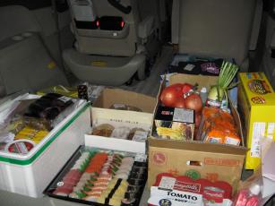 よく『ご機嫌伺い』と言うが、私に限っては、母のご機嫌伺いをするときには、主人の透析通院があるために思うように出て行けない私に代わって、行動的な母がうちに来る。いわゆる、ご機嫌呼び出しという形になってしまう。今日は、母が前々から『いつ、コストコに連れて行ってくれるの~~????』という駄々っ子のようなご要望にお答えしまして、やっとコストコに連れて行ってあげました。そうです、母のほうから我が家に乗り込んで来て『連れて行ってくれ~~!』状態で。そうなんです、今ではすっかり母のほうがコストコにはまってしまい、ちょっと間が空くと『ねえ、ねえ、いつ????』とまるで子供のよう............。今日も、母のご機嫌をやっとかなえてあげたわけで................。そう、私は全然行きたくなかったのですが、母の、母の、母の..........こらぁぁぁぁぁぁぁぁぁぁぁぁぁぁ~~~!!!!!loveyoshi!!貴様は、母上のせいにして、全然行きたくないだとぉぉぉぉぉぉぉぉ~~~????????????全然行きたくないやつが、こんなに買うかぁぁぁぁぁ~~~~??????? 手前のお寿司、これでおじいちゃん、娘2人分、主人の分のほか、私と母のお昼分が十分食べられたわけで、1980円。6人で回転すし行ったって2000円以内で食べられないです。お寿司の後ろにあるパウンドケーキ、ブルーベリー・アーモンド・オレンジピールの3種類が入ってて、698円。娘たちの大好物です、ハイ。というわけで、いつものようないつもの買い物をしてきたわけで、個人的に一番の収穫は...........ROXYの長袖Tシャツが1100円で買えた事。うれピー.......で??誰が行きたくなかった..............って????????