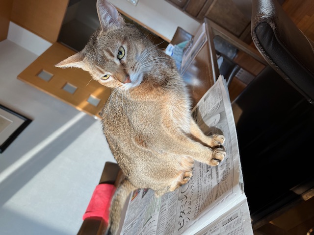 新聞に目を通し、朝食を済ませ、ロマネちゃんと戯れる。