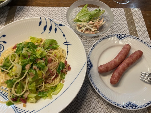 本日の夕食は、春キャベツのパスタ、野菜サラダ、ソーセージでした。