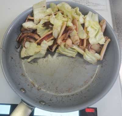 相変わらずにこびり付き難いグリーンパンでイカを焼きました