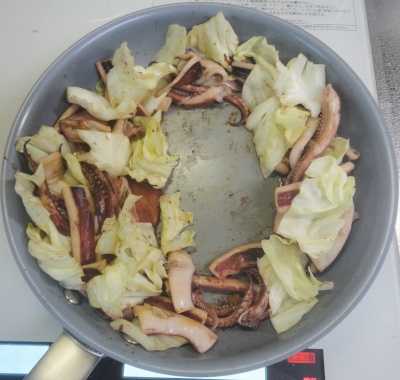 キャベツを入れて温度が下がるとこびり付きはスルッと剥がれました