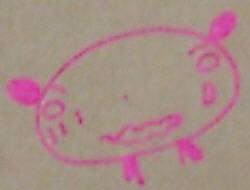 自分がよく描くキャラクター(?)の話になった。「商品化すれば、絶対に売れる!」と、誰かが言ってた……らしい。特許取れるのかなぁ?笑ちなみに、参考にしたキャラクターや絵柄はいくつかあったのですが、結局はどれもピーンと来ず、即興オリジナル。“ありんこ”だの“パンダ”だの“クマ”だのと言われるのですが、皆さんはこれを何と捉えますか???見えづらくてスミマセン……ミニミニversionです。某氏のバースデーの時に、このイラスト入りのカードを渡しました。もうすぐバレンタインってコトで……最新作!?